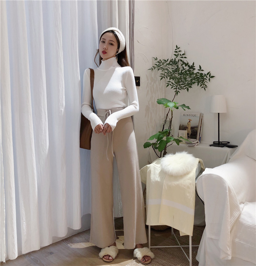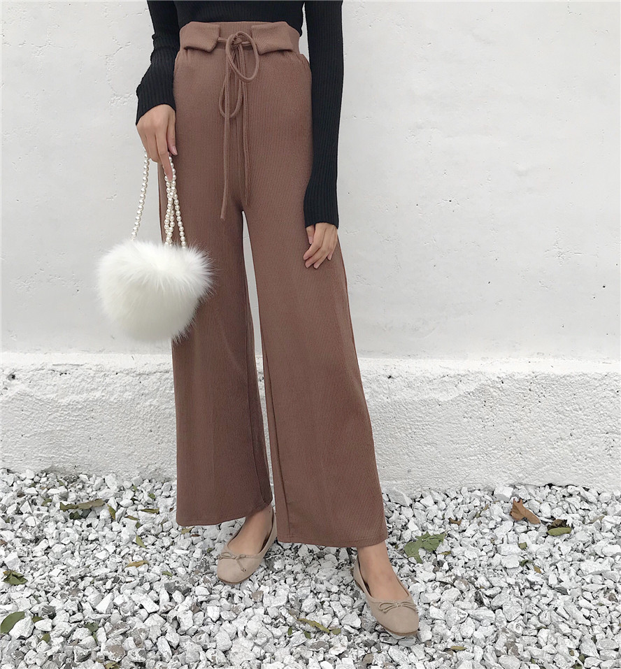 / 晚晚風同款系腰帶針織學生百搭長褲秋冬高腰顯瘦寬松休閑闊腿褲女
