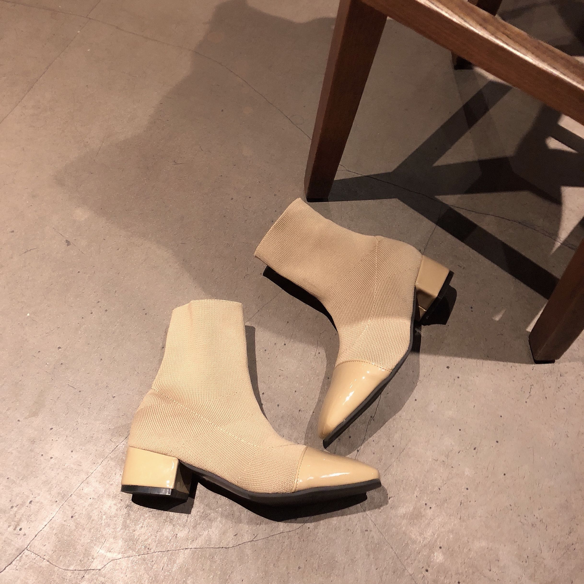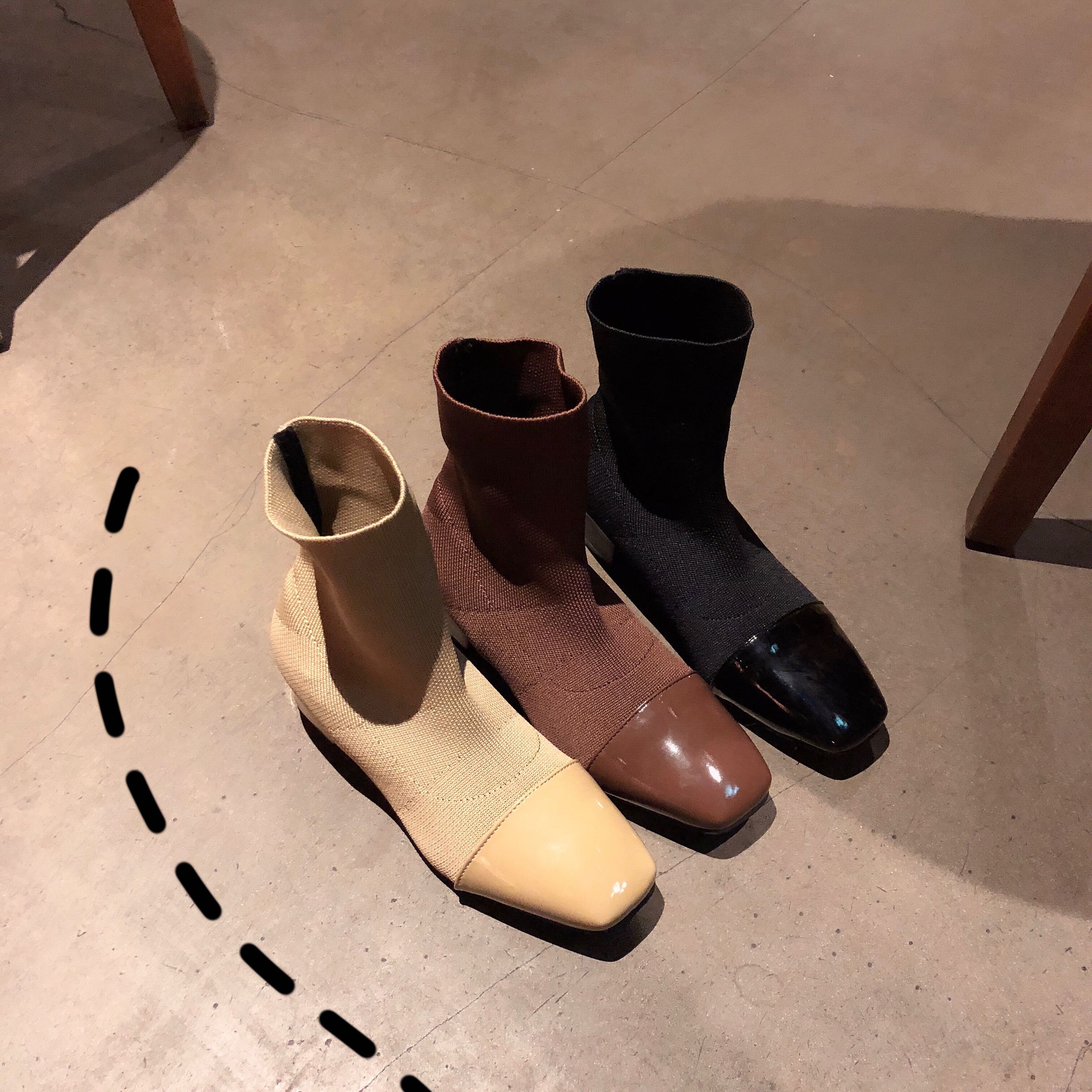 / 2018韓國新款chic百搭純色PU鞋套腳方頭中筒靴黑色高幫鞋女鞋柔軟