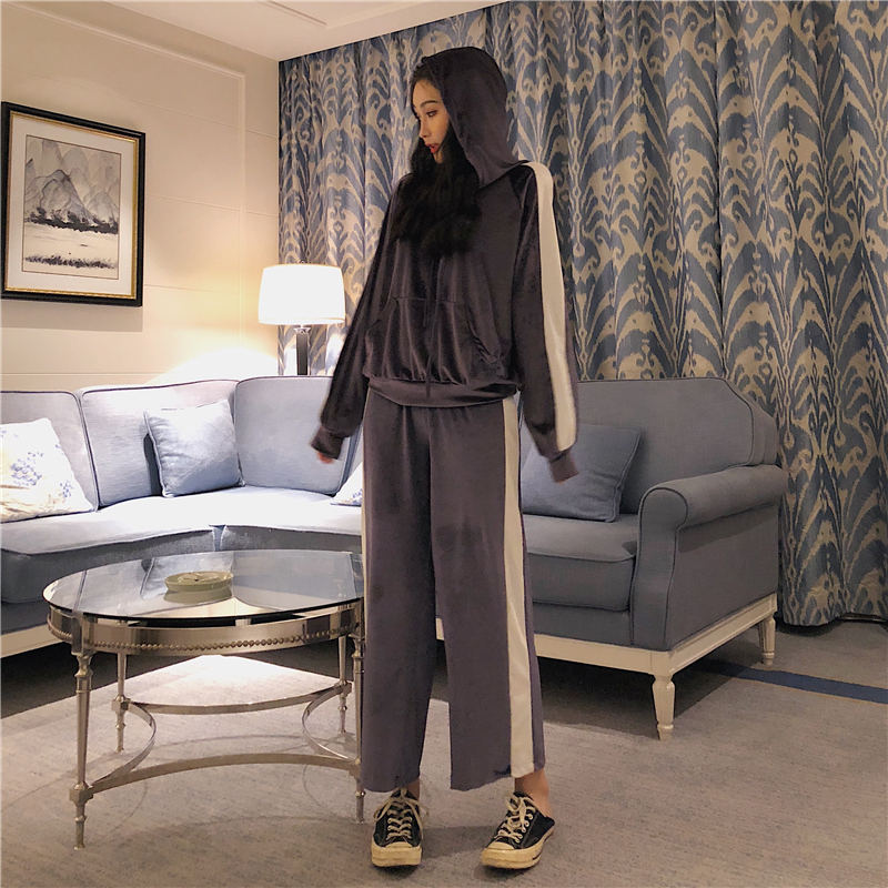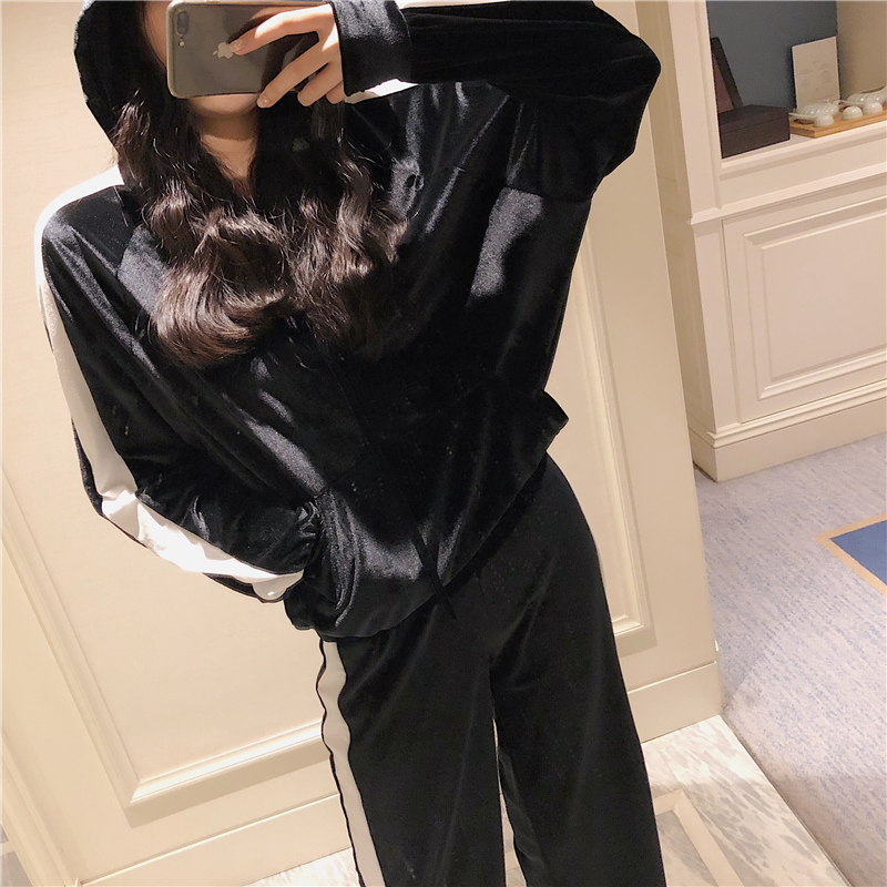 港味女神套裝秋冬絲絨連帽套頭拼接衛衣+彈力腰休閑闊腿褲兩件套