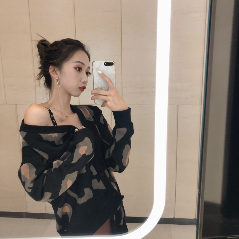 / 針織衫外套女秋裝2018新款慵懶風寬松撞色豹紋開衫中長款毛衣外搭