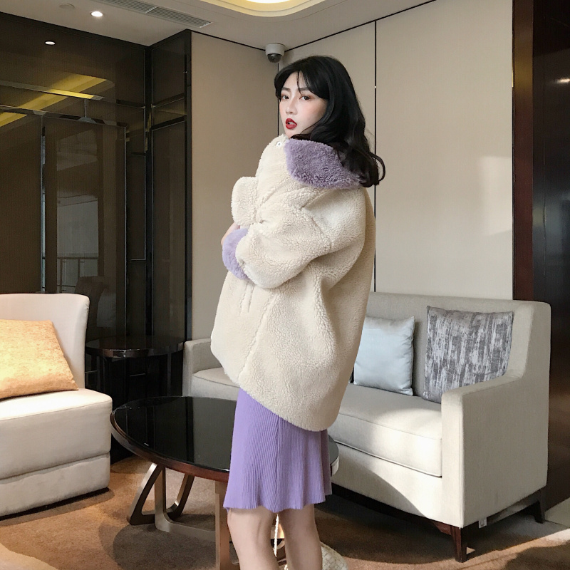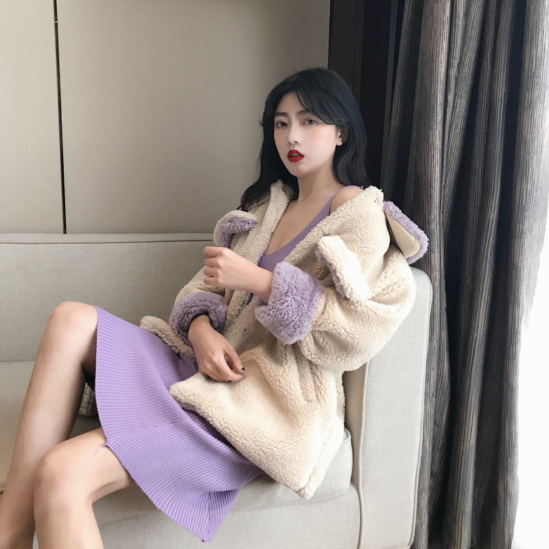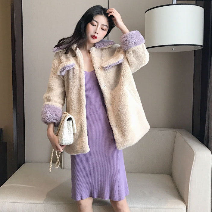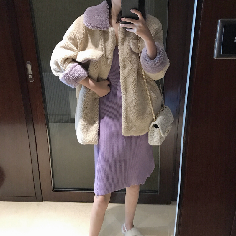 / 2018秋冬新款羊羔毛外套女加厚加絨時尚撞色毛絨大衣+連衣裙套裝