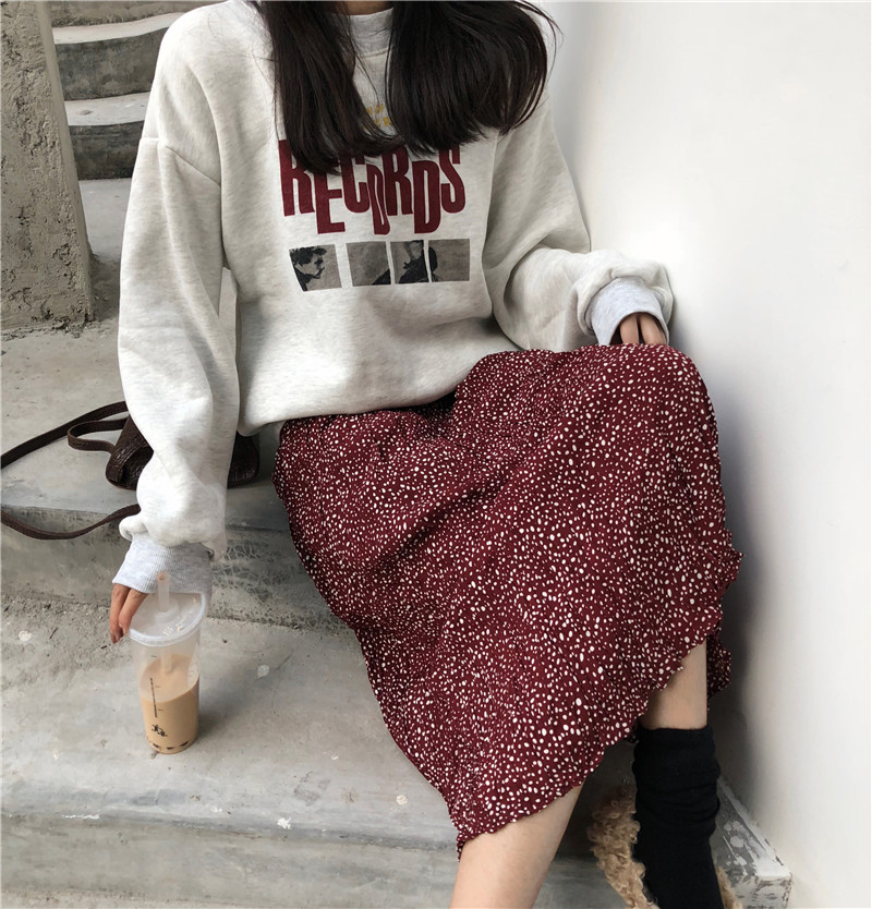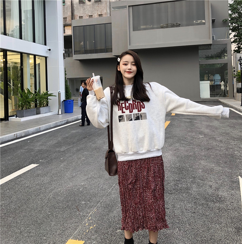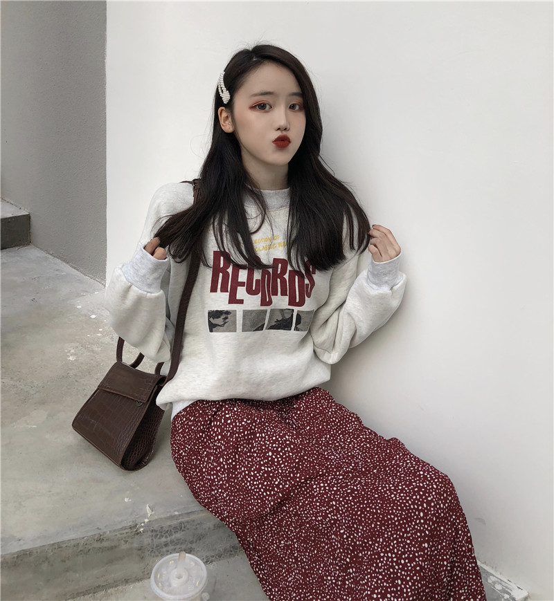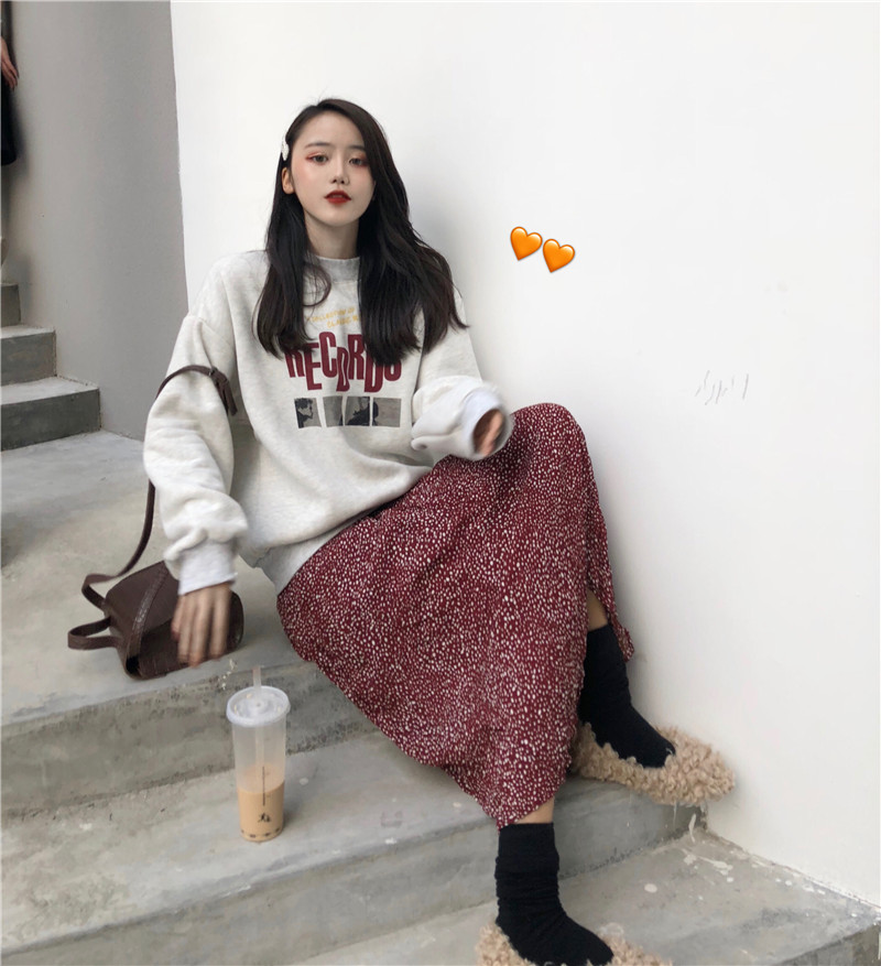 復古立領長袖保暖加絨衛衣+碎花半身裙