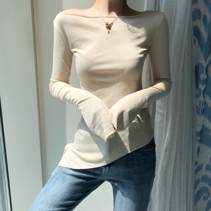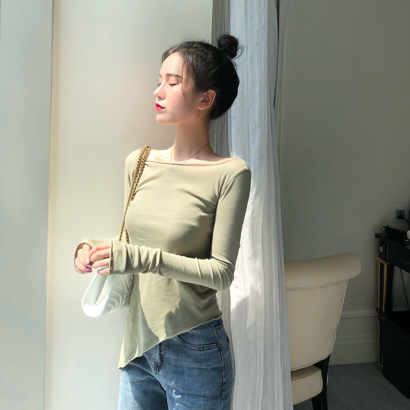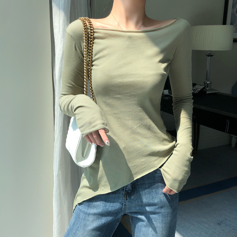 早秋2018新款韓版上衣女斜邊不規則長袖露肩顯瘦純色修身學生T恤
