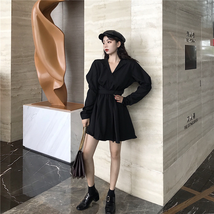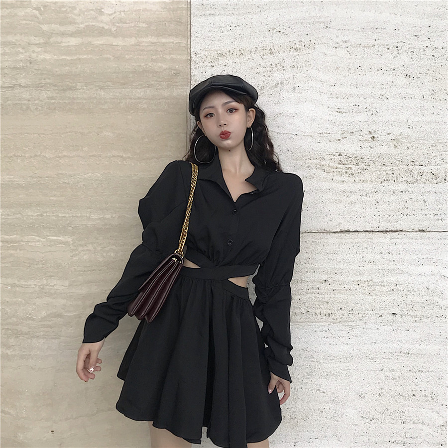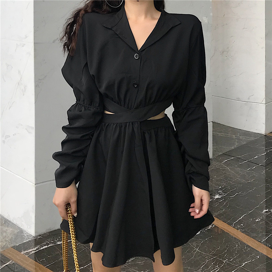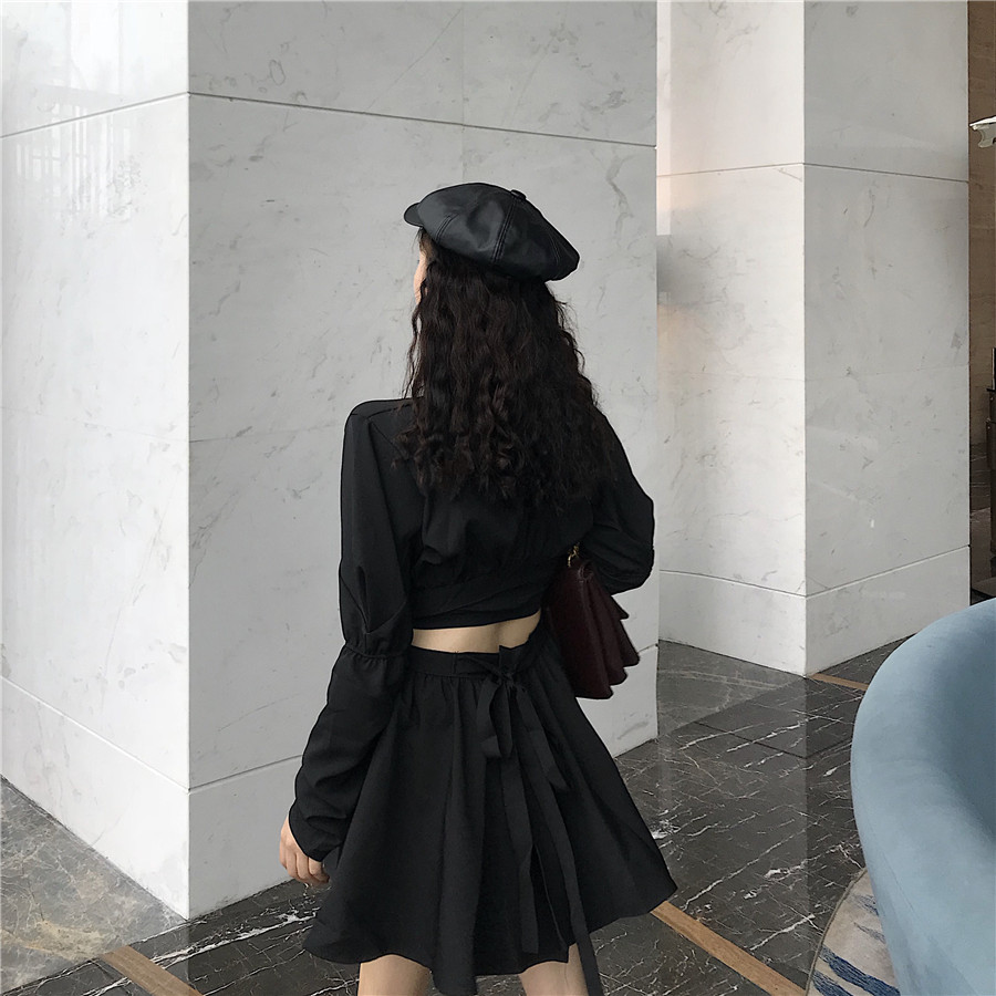 / 2018秋裝新款韓版小心機露腰短裙chic泡泡袖交叉綁結收腰連衣裙女