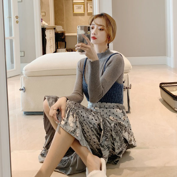 / 韓版氣質高腰荷葉邊A字裙+后背綁帶針織吊帶女+針織打底衫三件套