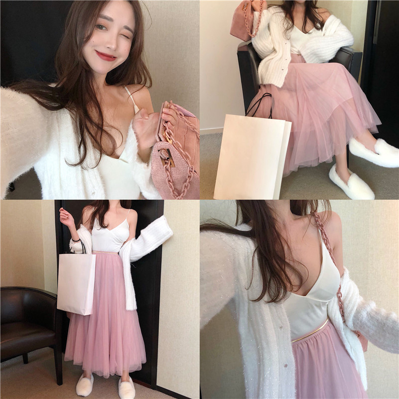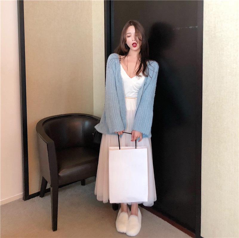 寬松白色網紅毛衣甜美小清新開衫韓版時尚套裝網紗裙子chic兩件套