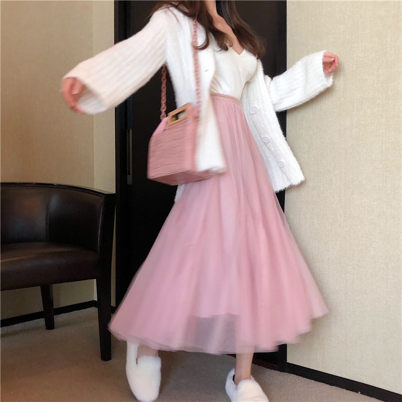 白色毛衣開衫|藍色毛衣開衫|粉色網紗裙|白色網紗裙