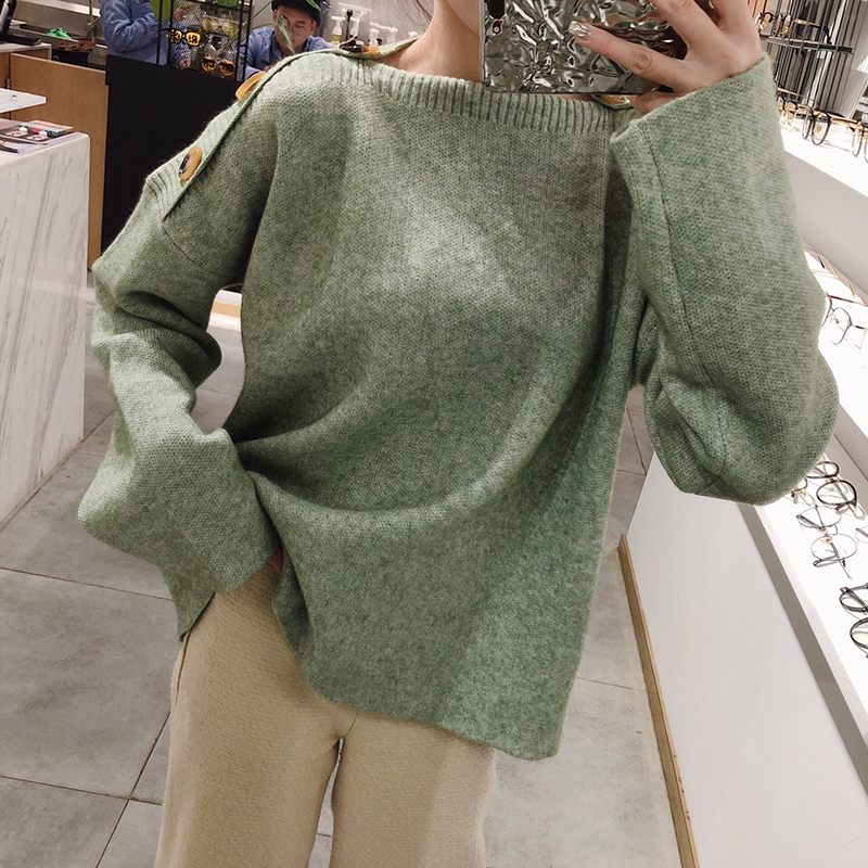 慵懶風套頭毛衣女2018新款秋冬韓版時尚一字領寬松純色針織衫上衣
