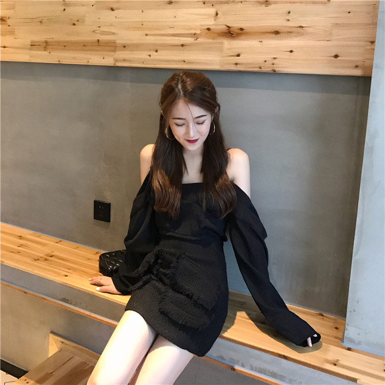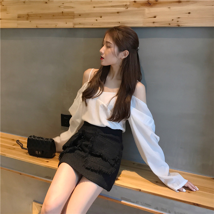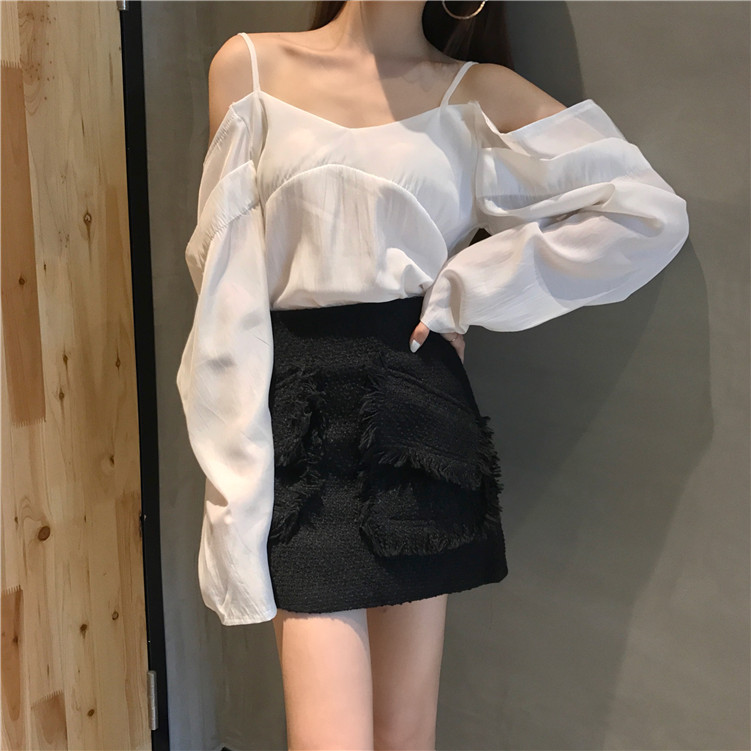 / 復古氣質V領吊帶漏肩長袖上衣高腰短裙2018新款女夏港風韓版套裝