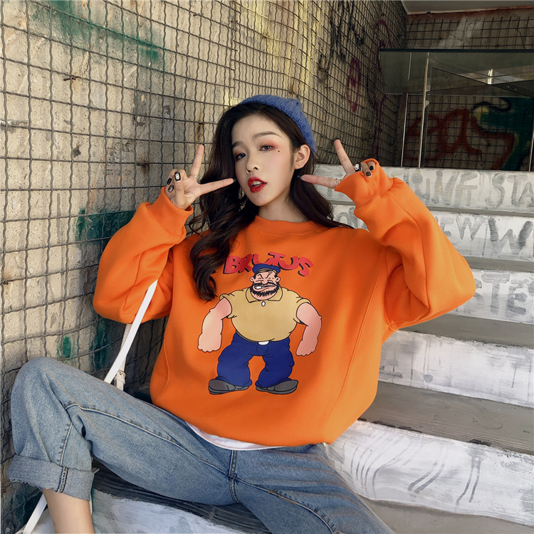 復古港風網紅同款加絨大力水手卡通印花圓領衛衣女秋冬2018新款潮