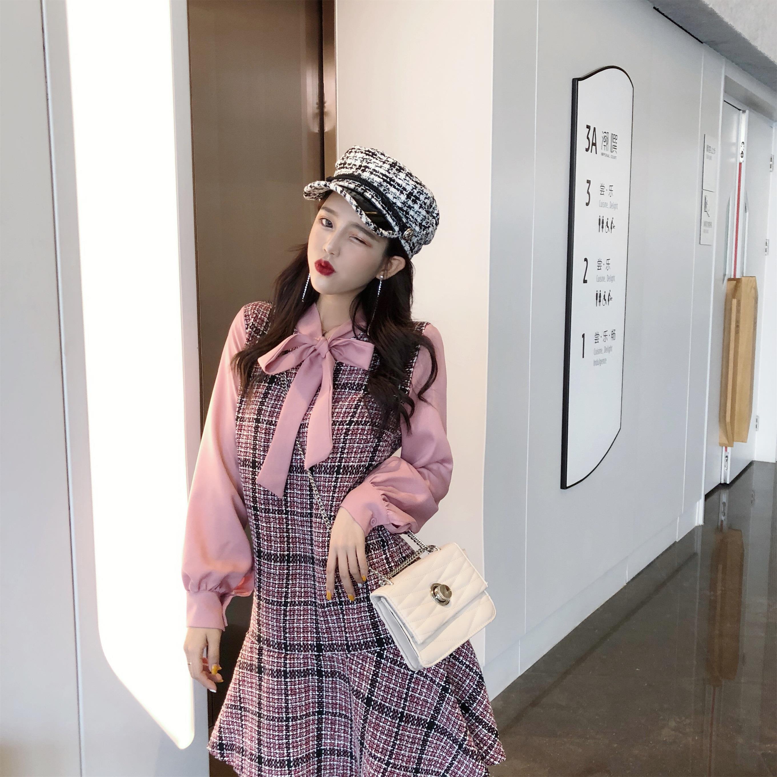 / 時尚氣質新款秋季chic韓版百搭長袖襯衫格子中裙淑女蝴蝶結連衣裙