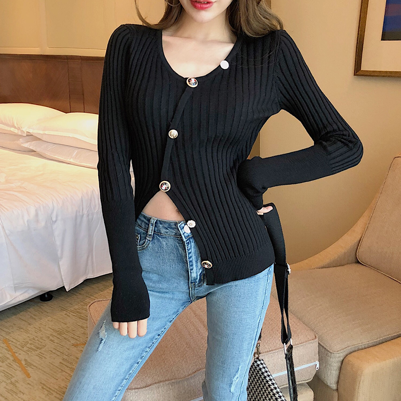 2018秋冬新款韓版上衣復古chic長袖純色修身顯瘦百搭單排扣針織衫