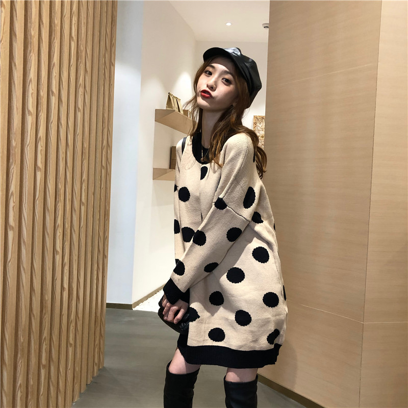 / 慵懶針織連衣裙女2018秋冬新款百搭波點寬松中長款套頭長袖毛衣女