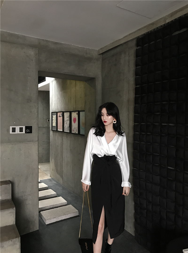 / 新款性感大v領襯衣復古OL風中長款高腰開叉半身裙兩件套時尚套裝