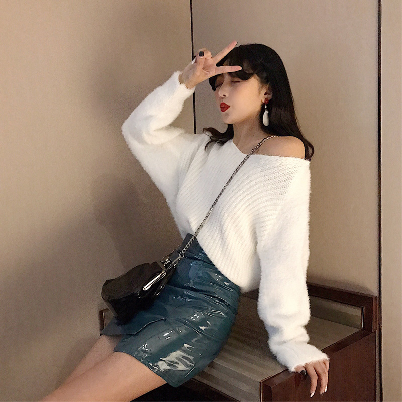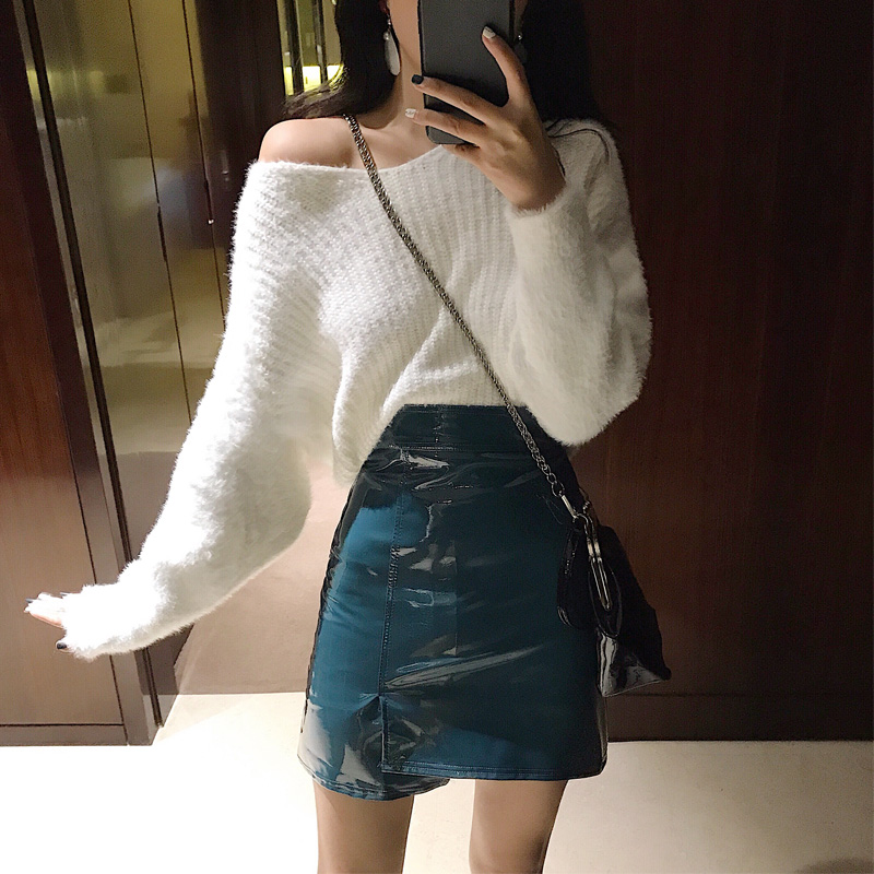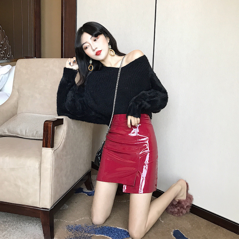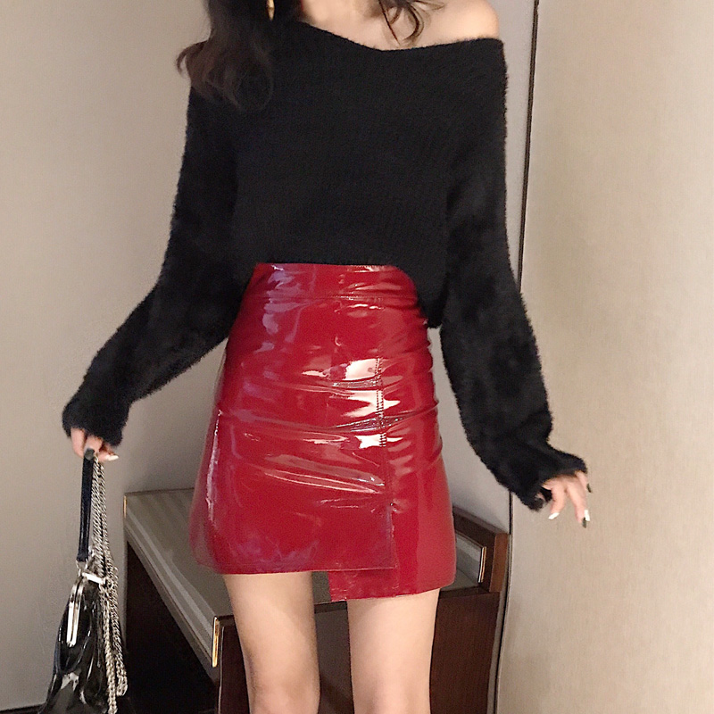 / 港味針織寬松V領毛衣不規則包臀亮皮PU皮半身裙時尚套裝兩件套女