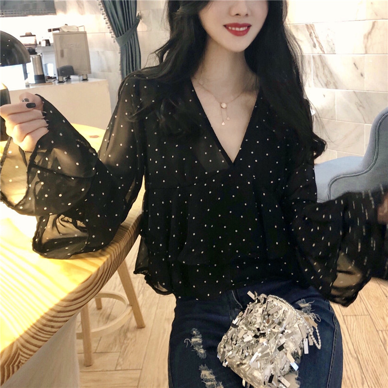 / 韓風chic復古黑色波點V領荷葉袖上衣女顯瘦百搭寬松打底雪紡衫夏