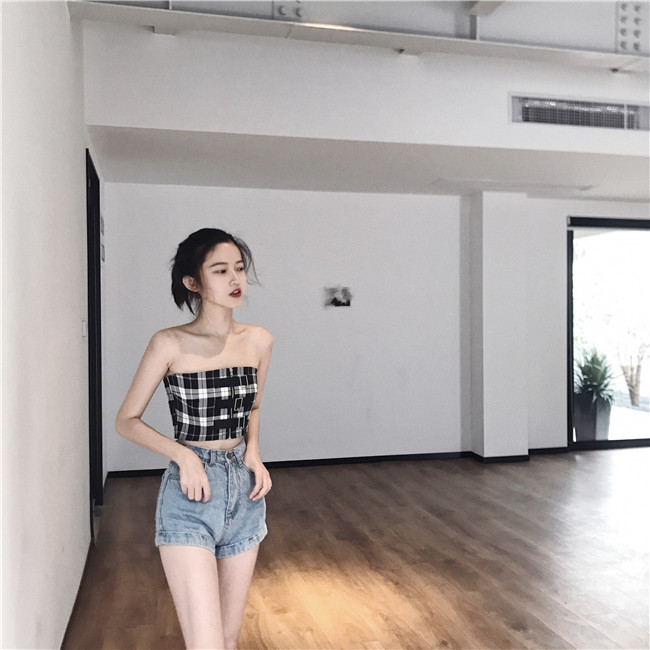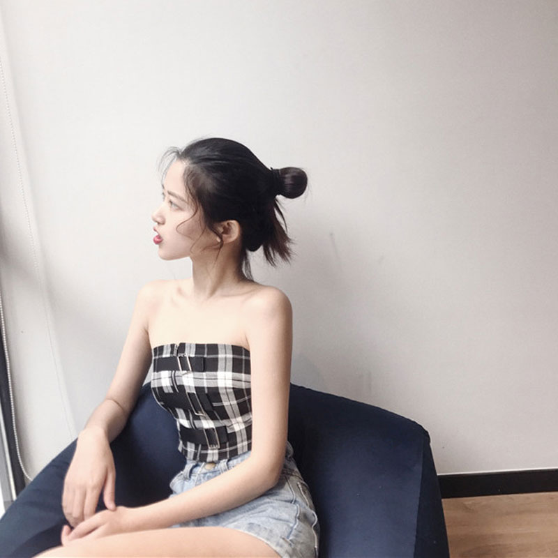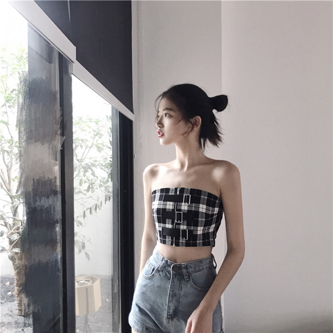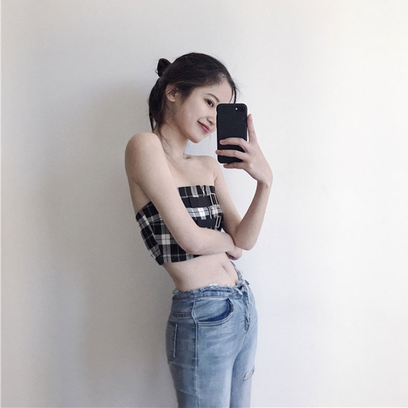 / 2018新款修身短款格子抹胸修身顯瘦性感小心機chic港味復古背心潮