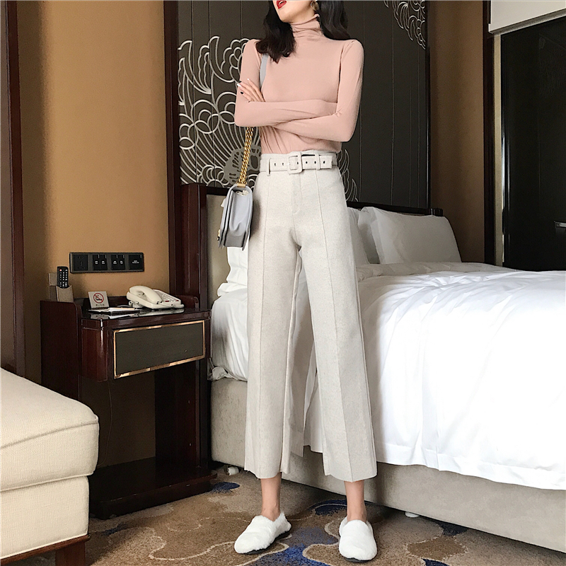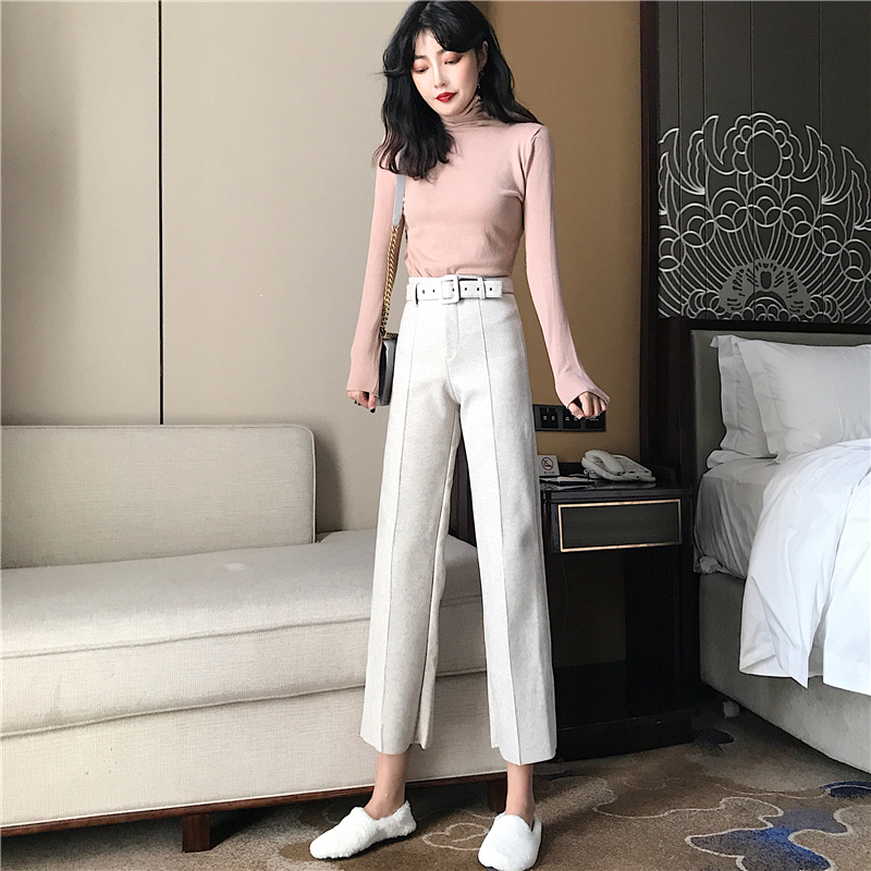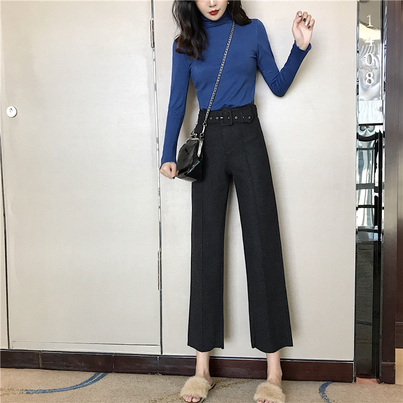 / 港味復古秋裝女2018新款修身高領打底針織衫+高腰毛呢休閑褲套裝