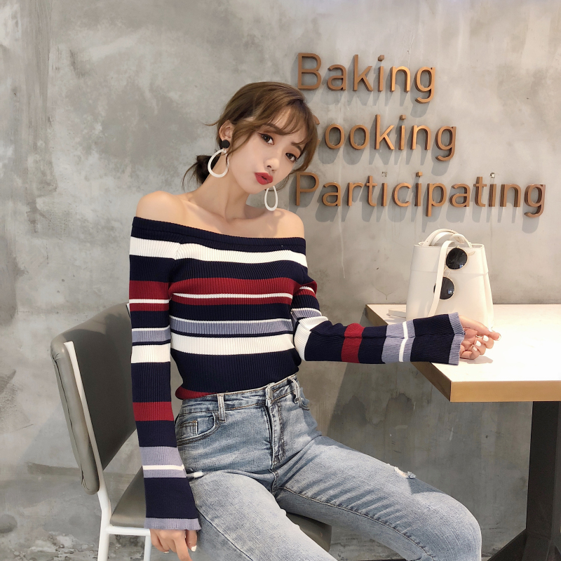 2018秋季港風時尚新款修身一字領露肩兩穿喇叭袖百搭針織衫女上衣