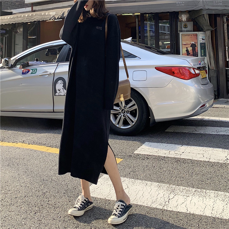 / 慵懶風套頭毛衣女2018新款秋冬韓版長款純色修身氣質開叉連衣裙女