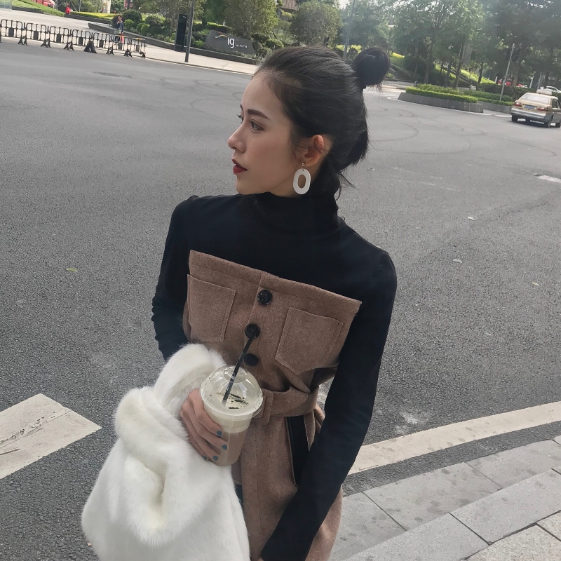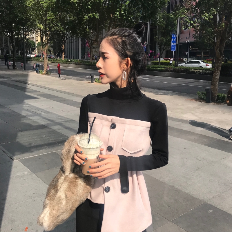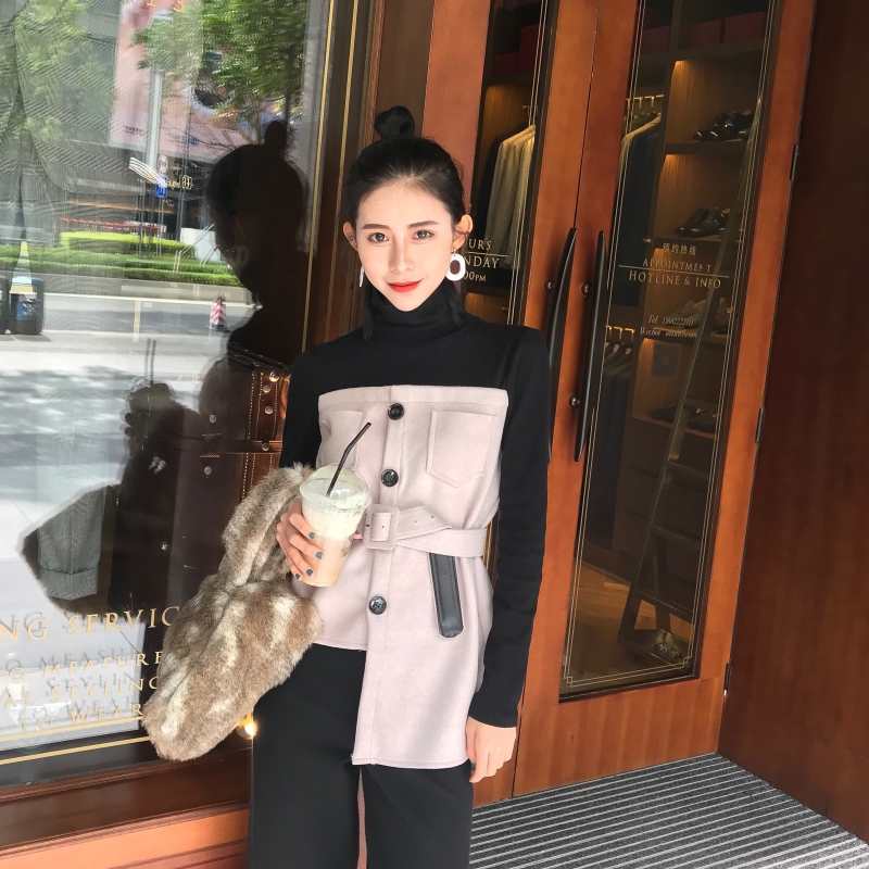 / 百搭高領拼接新款韓版假兩件設計感秋季chic修身不規則上衣配腰帶