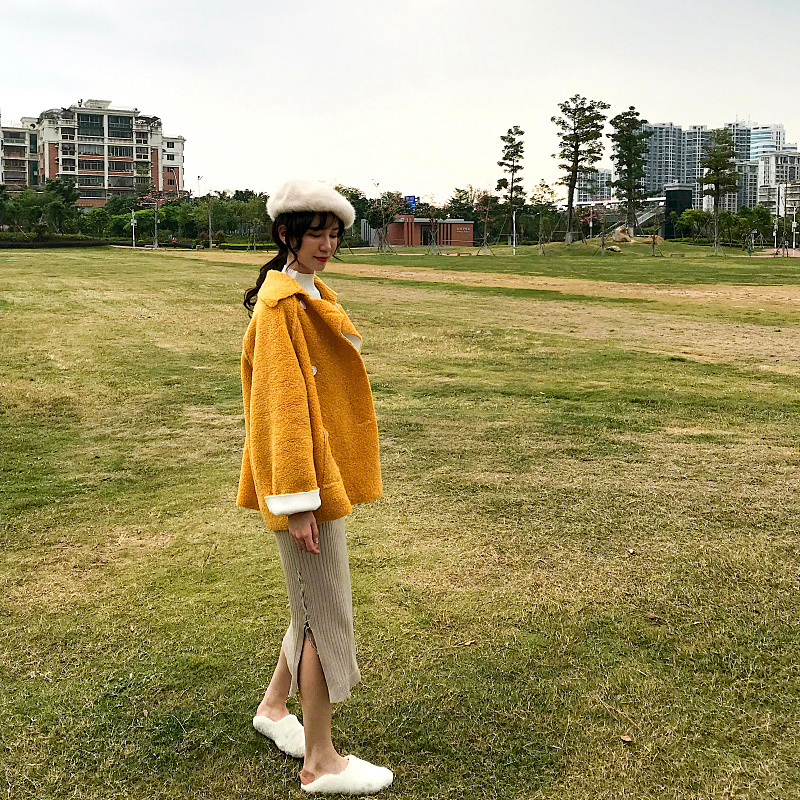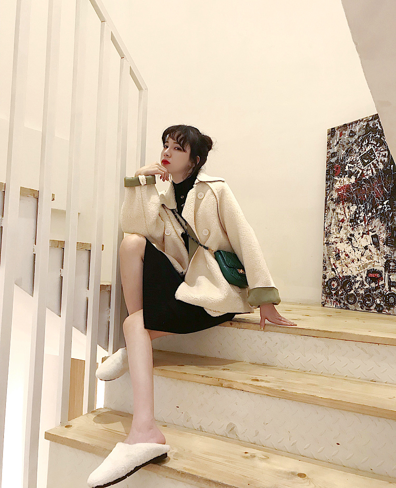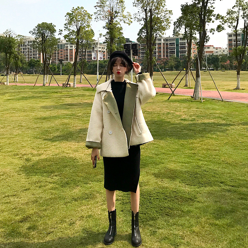 / 韓版羊羔毛毛呢外套女冬季大衣女新款百搭寬松翻領長袖雙排扣夾克