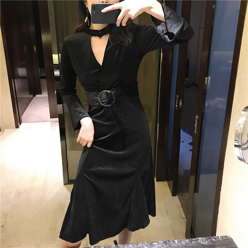 / 新款韓版chic秋季百搭顯瘦鏤空V領掛脖綁帶收腰復古絲絨連衣裙女