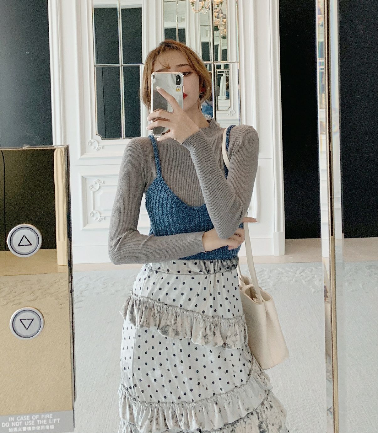灰色上衣|杏色上衣|藍色背心|卡其色背心|杏色裙子|灰色裙子
