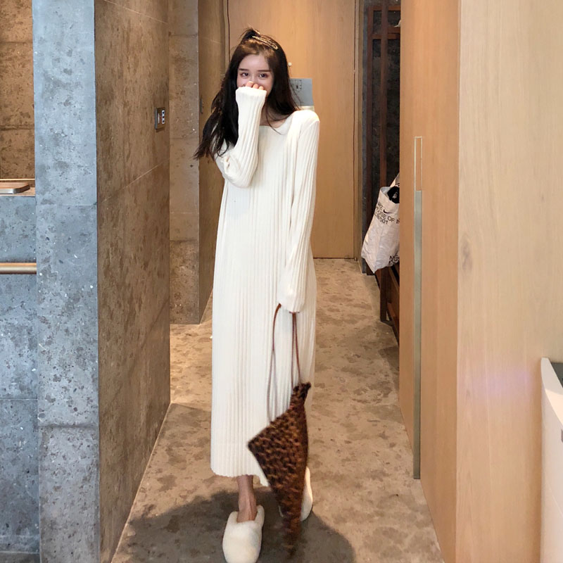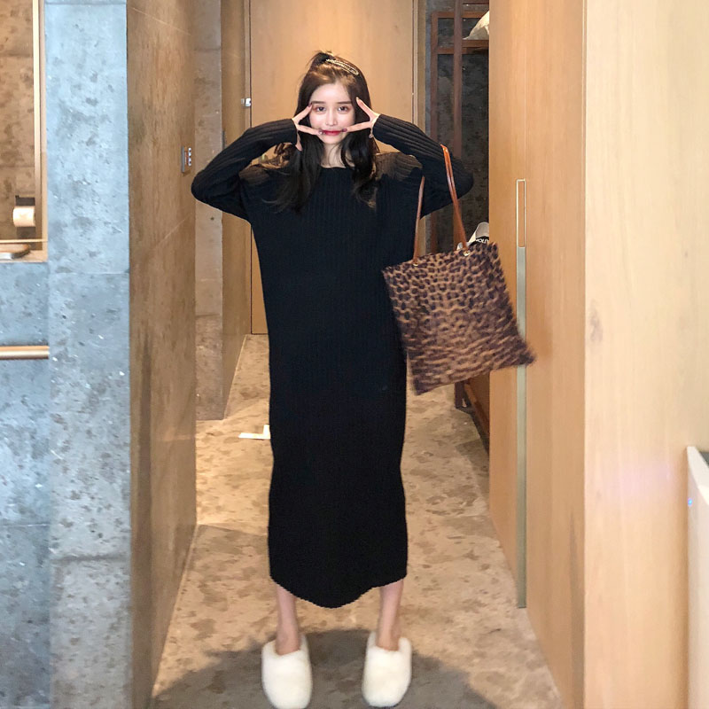 慵懶風套頭毛衣女2018新款秋冬韓版長款純色修身氣質開叉連衣裙女