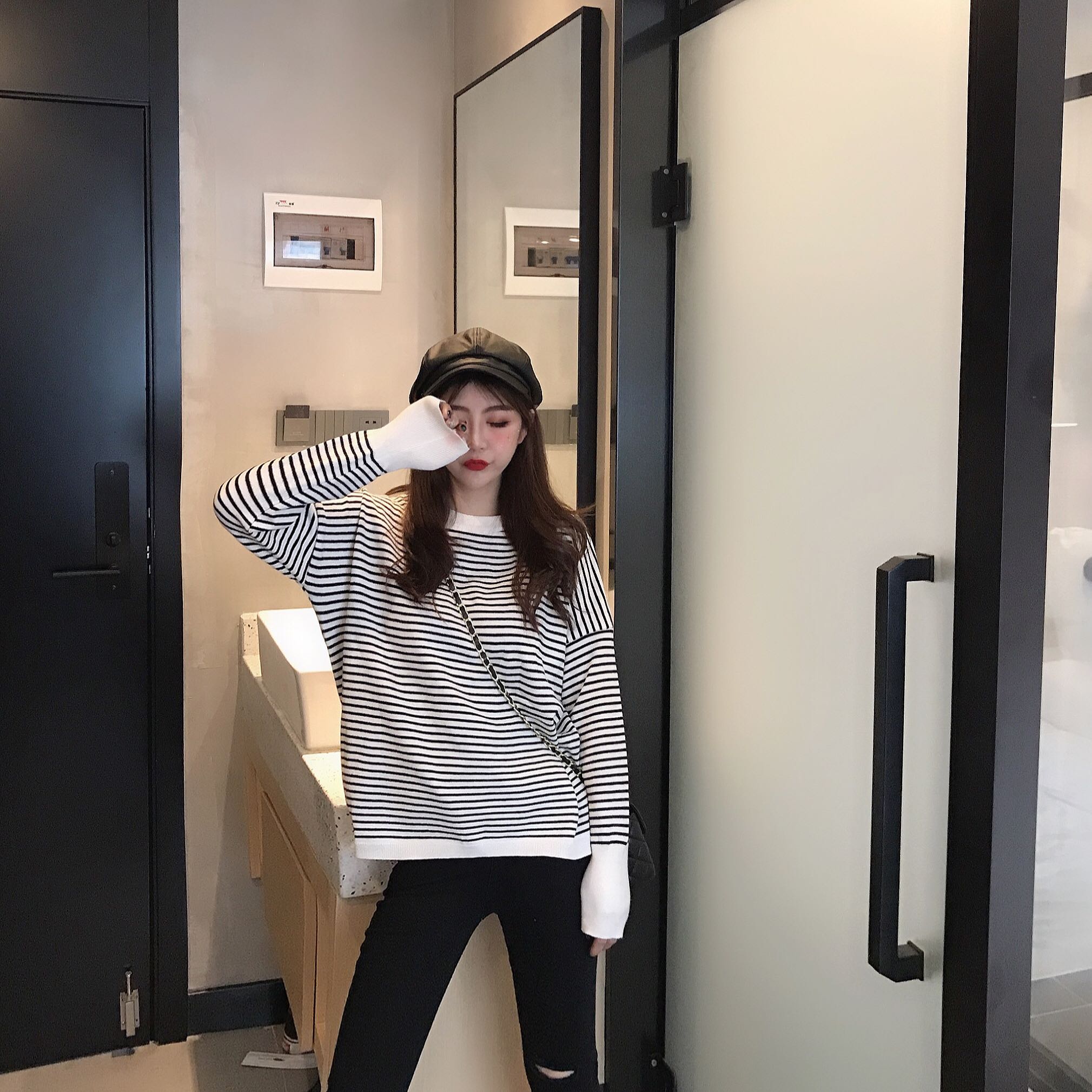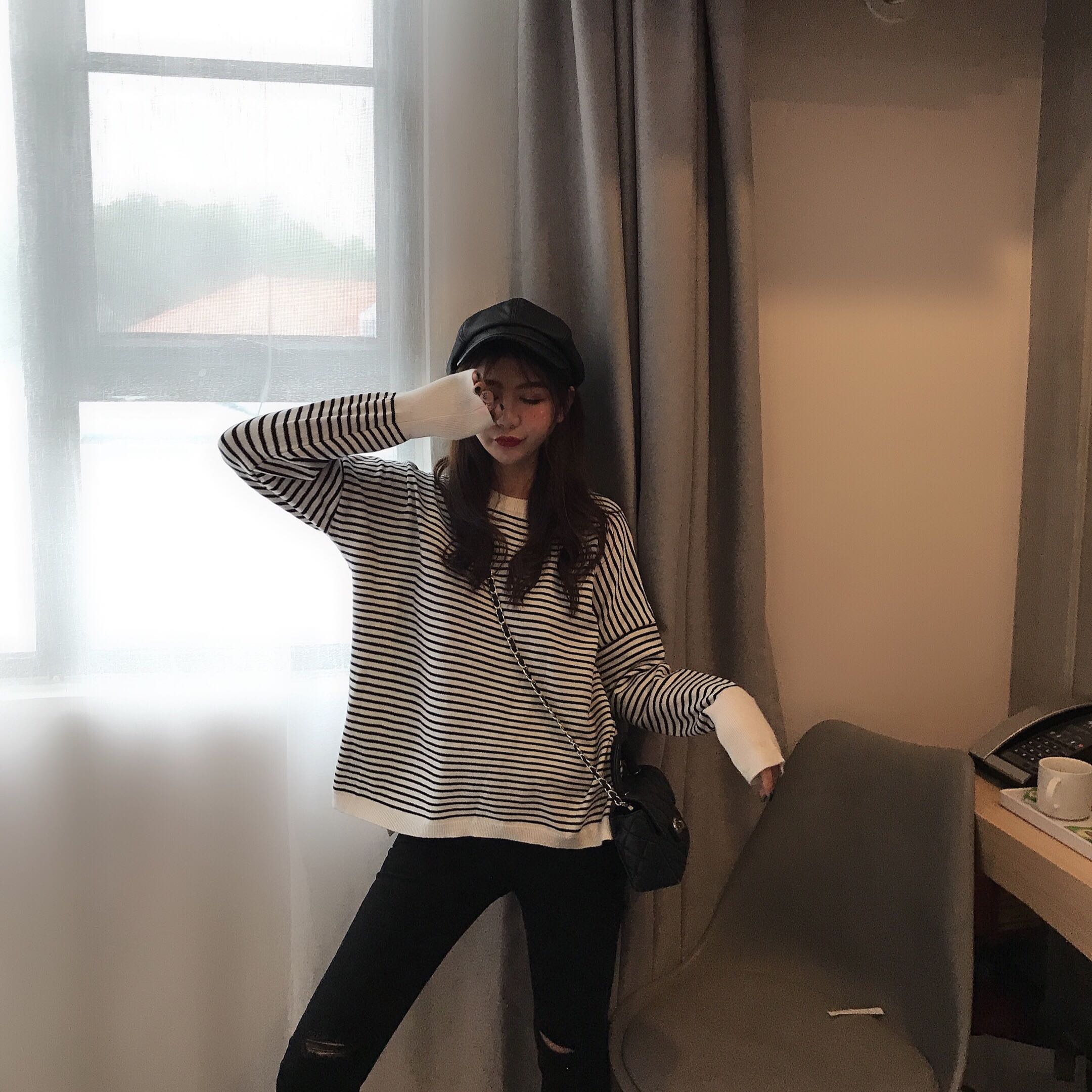 / 復古港味條紋包心莎柔軟寬松長袖針織上衣冬季韓版毛衣女2018新款