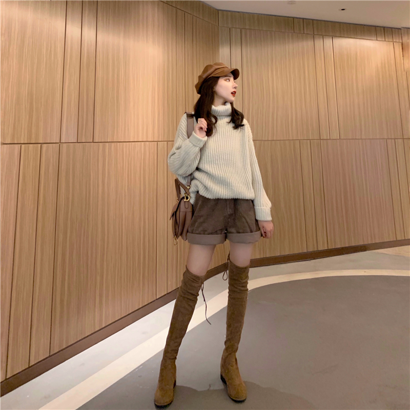 時尚高領慵懶風毛衣女秋冬2018新款+寬松時尚卷邊燈芯絨短褲套裝