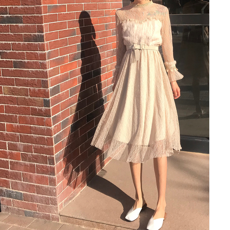 / 晚晚風時尚氣質百搭拼接毛喇叭袖收腰中長款蕾絲裙連衣裙女配腰帶