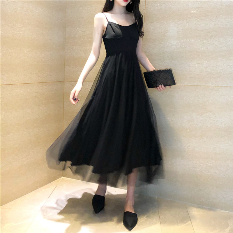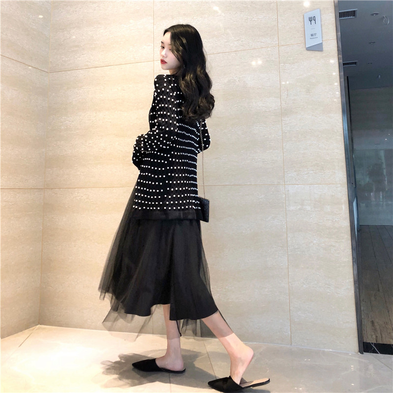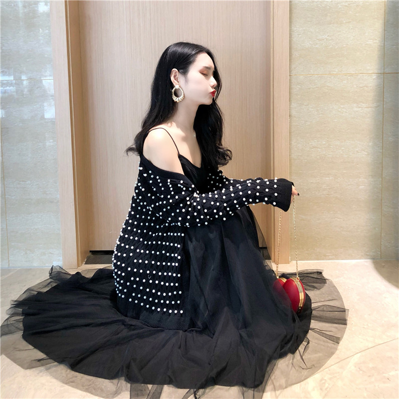 / 韓國復古風重工珍珠毛衣外套女+中長款修身網紗氣質吊帶連衣裙潮