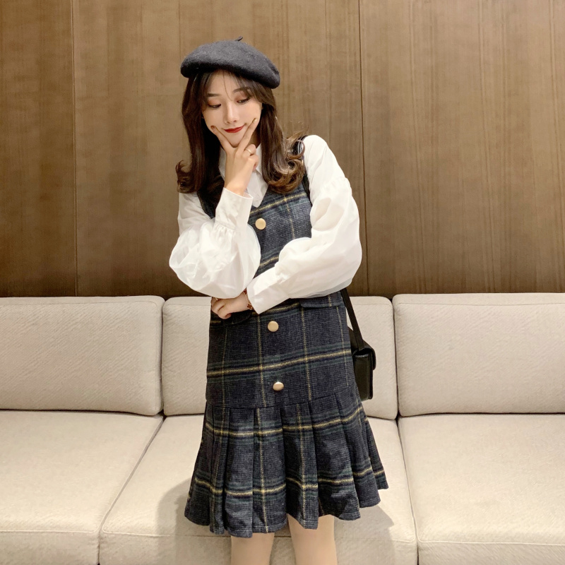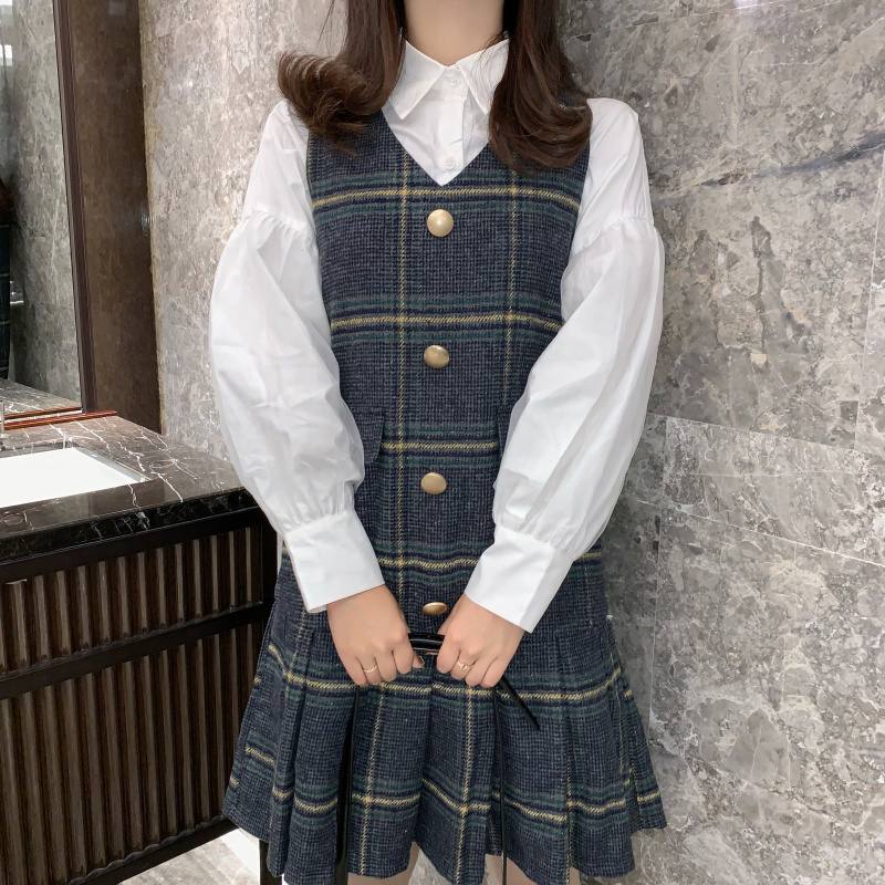 / 復古格子V領無袖呢子百褶背心連衣裙女+優雅長袖襯衫襯衣時尚套裝