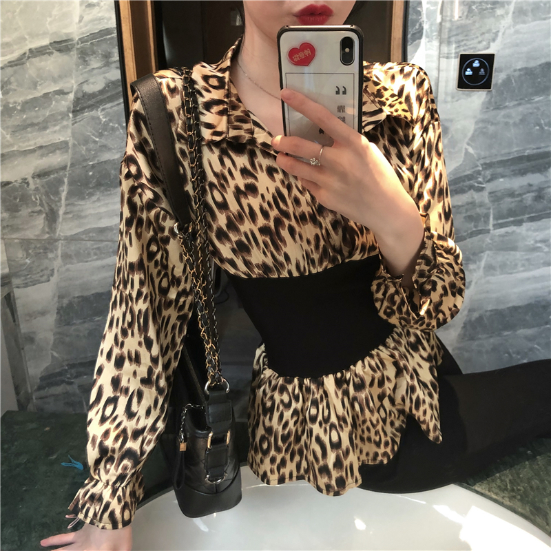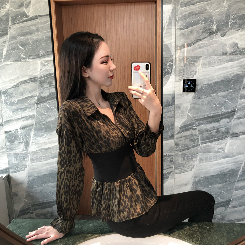 chic早秋上衣女2018新款韓版白底啊時尚豹紋印花收腰V領拼接襯衫