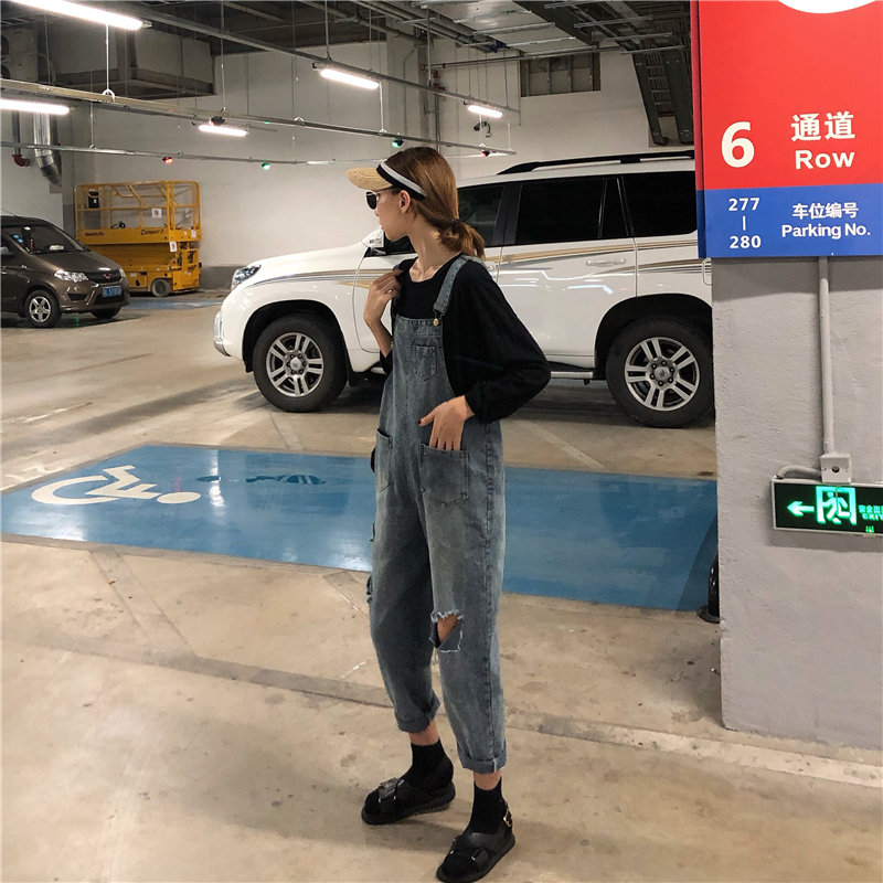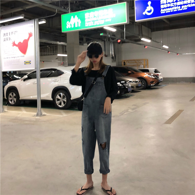 / 2018新款女夏學院風百搭復古chic風口袋破洞小清新學生牛仔背帶褲