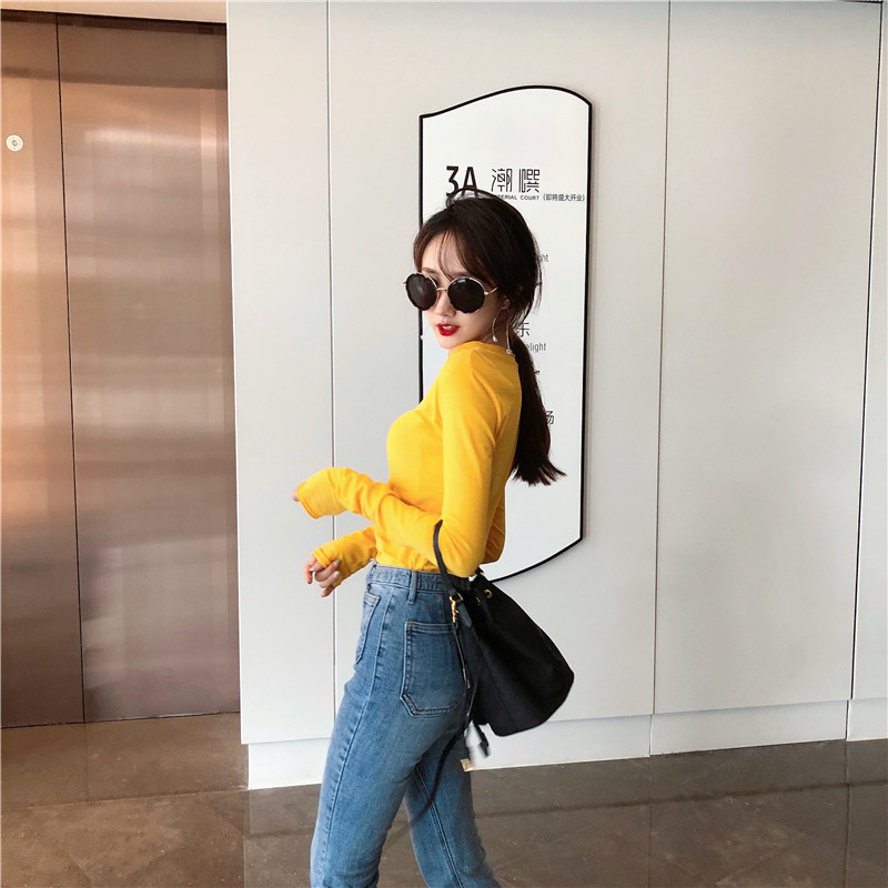 秋季2018新款韓版復古chic時尚T恤打底衫圓領學生百搭純色上衣女