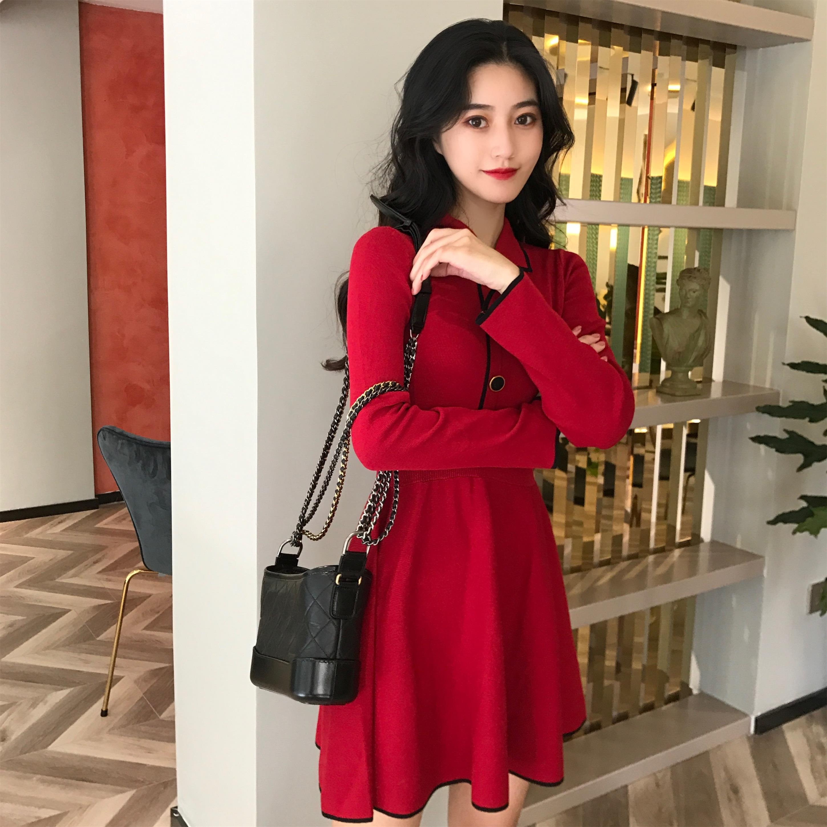 / 2018新款秋季韓版Chic氣質百搭修身顯瘦翻領高腰針織長袖連衣裙女