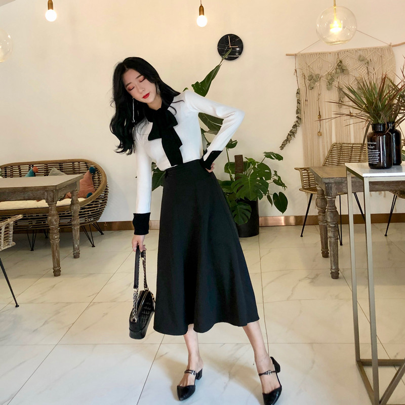 秋裝新款修身復古chic韓版氣質百搭撞色圍巾領針織衫女打底上衣潮