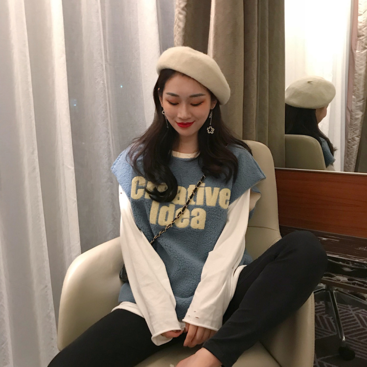 2018女神套裝新款寬松羊羔毛馬甲+冬裝上衣女慵懶長袖t袖女破洞T