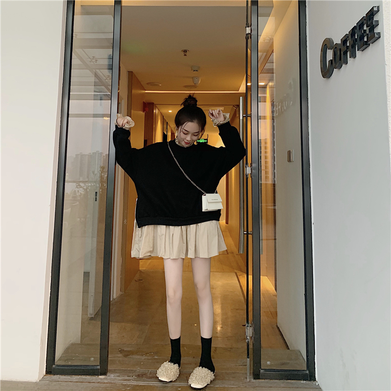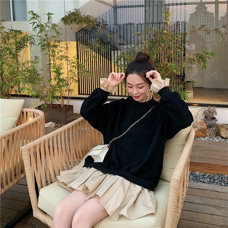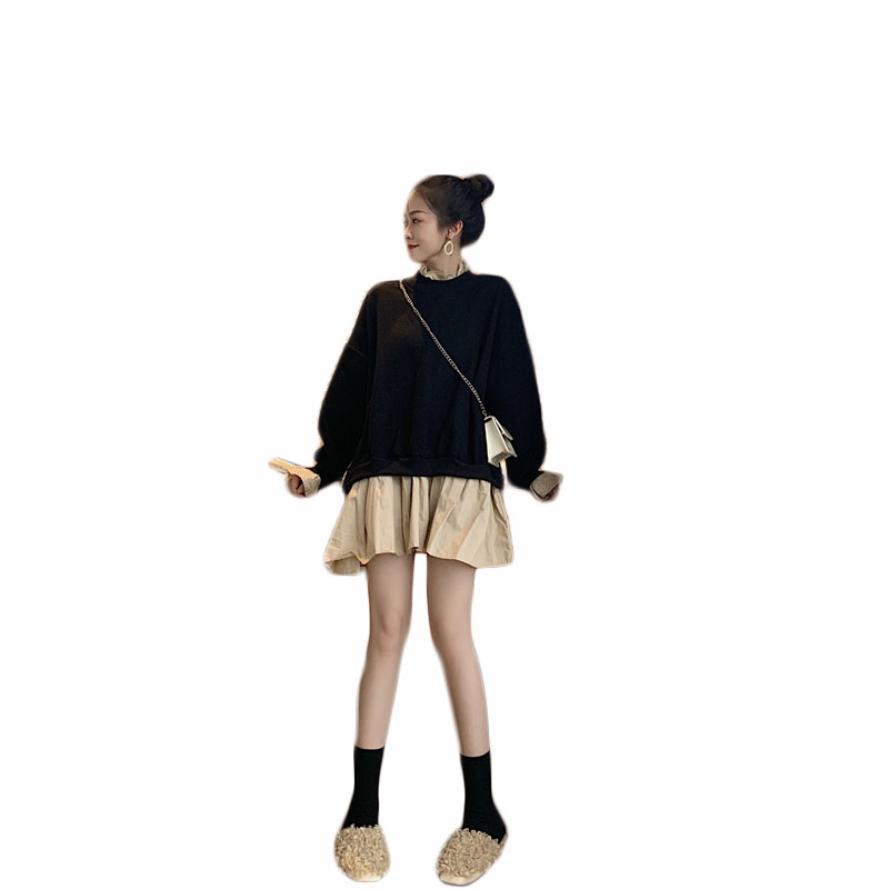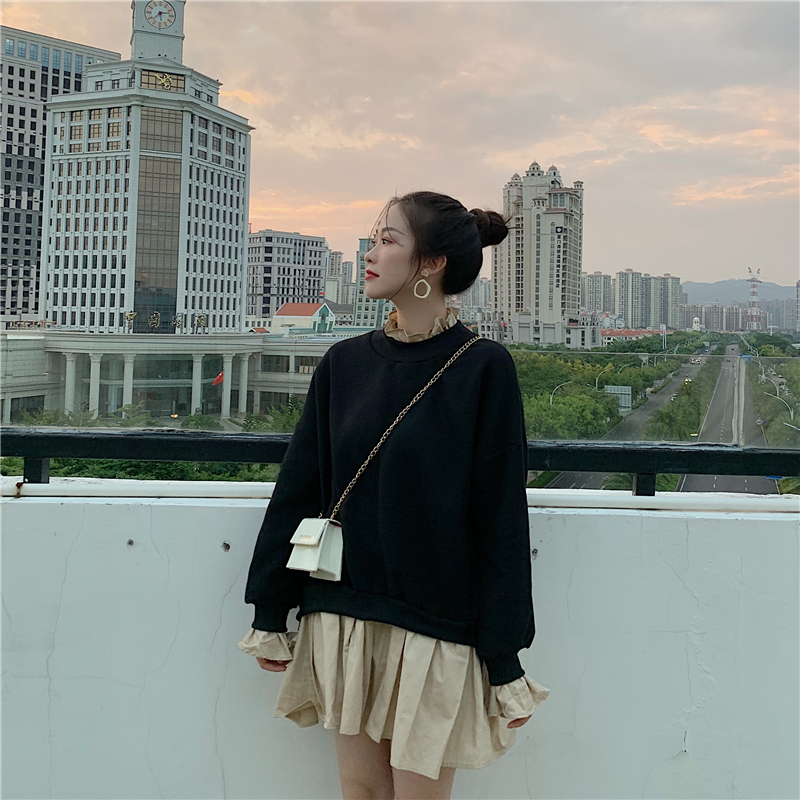 / 韓版寬松顯瘦假兩件加絨衛衣2018新款女秋中長款拼接木耳邊衛衣裙