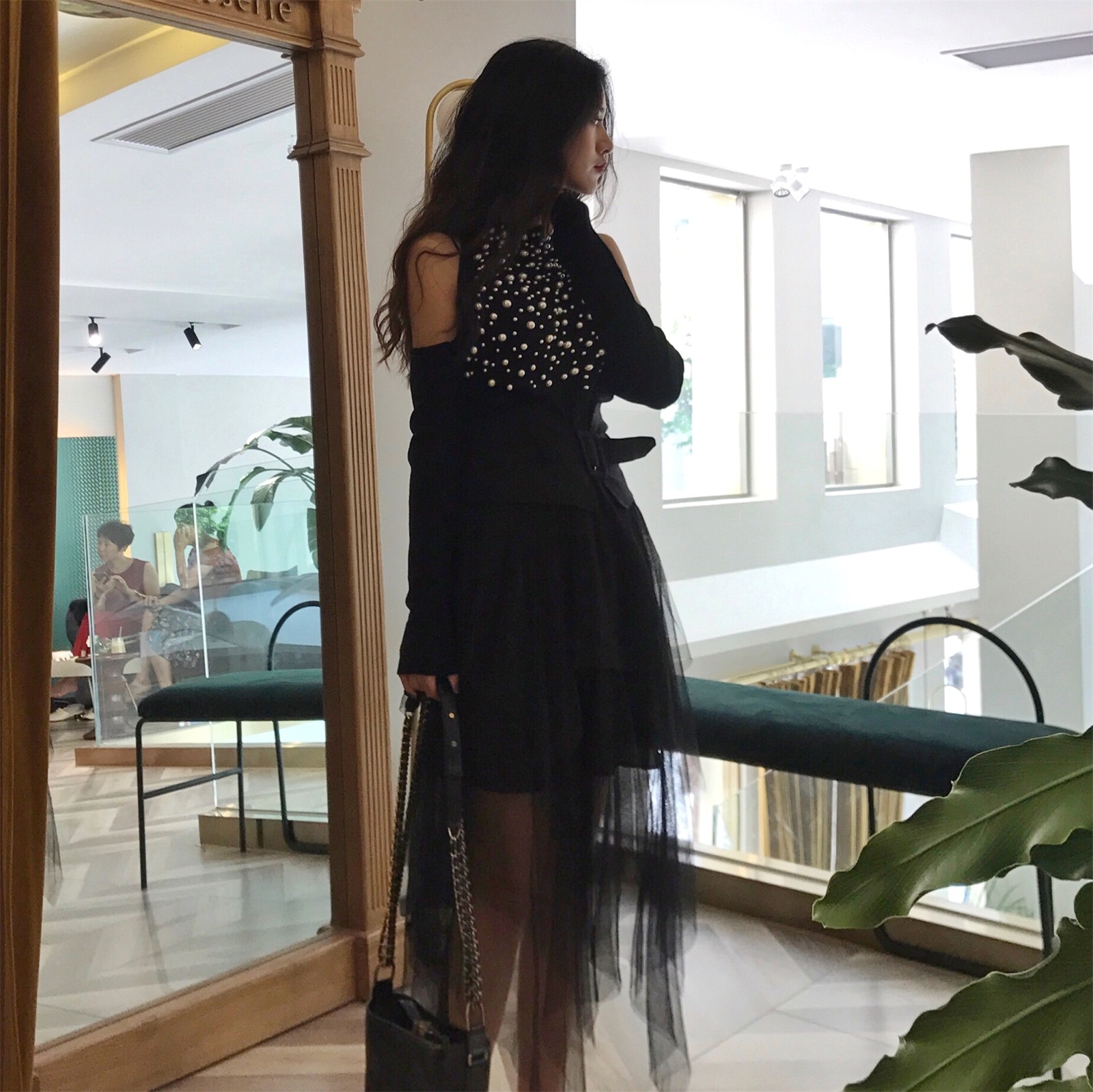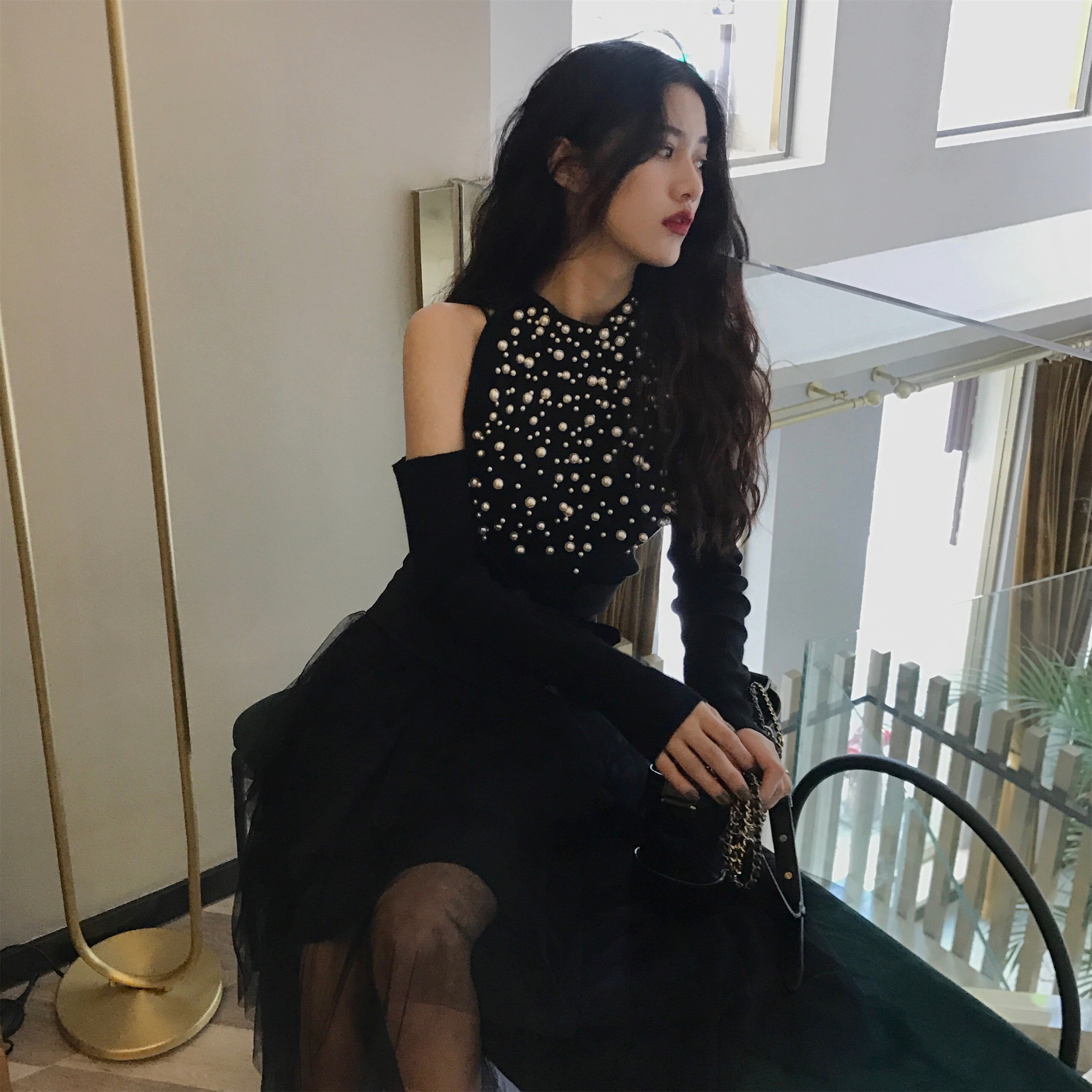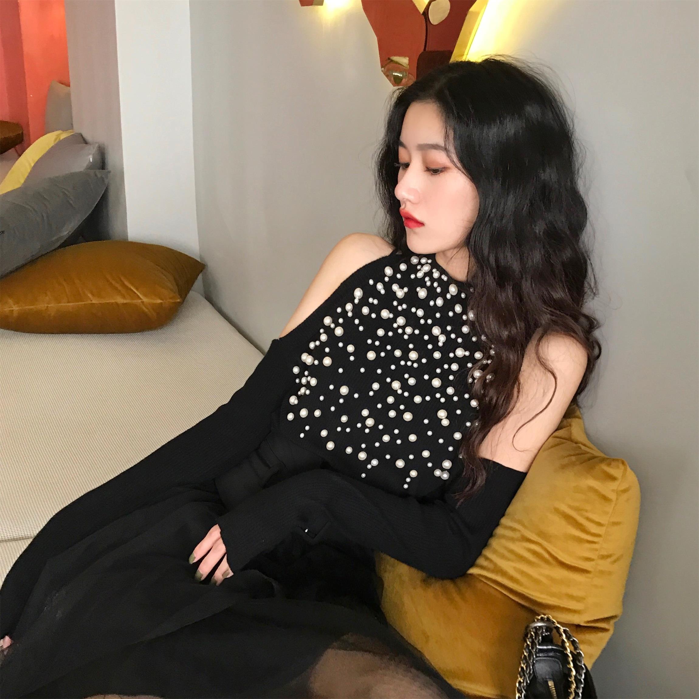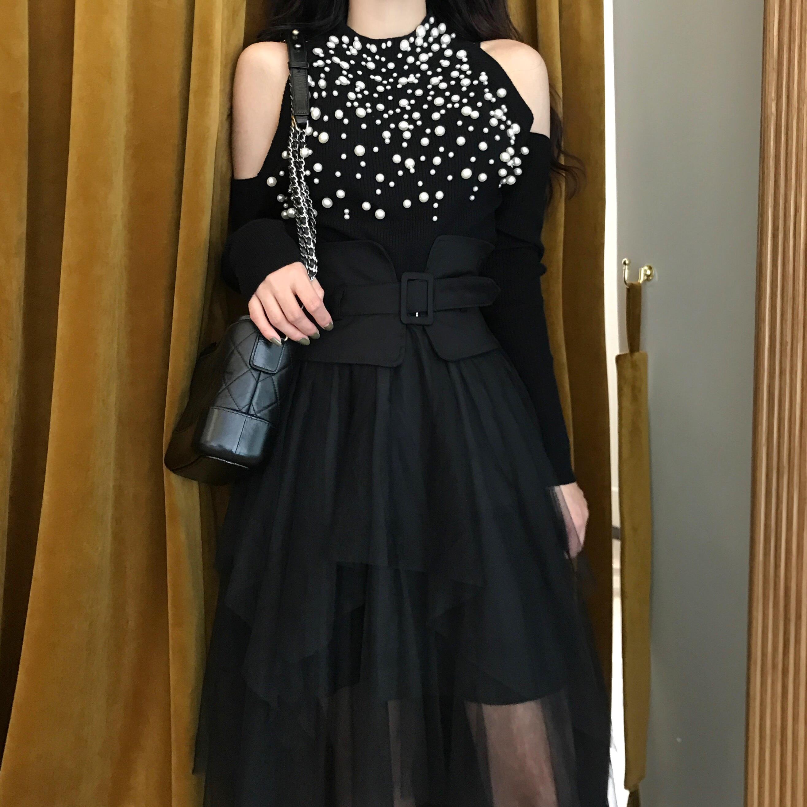 / 韓版重工釘珠性感露肩針織毛衣高腰綁帶網紗半身裙時尚套裝兩件套