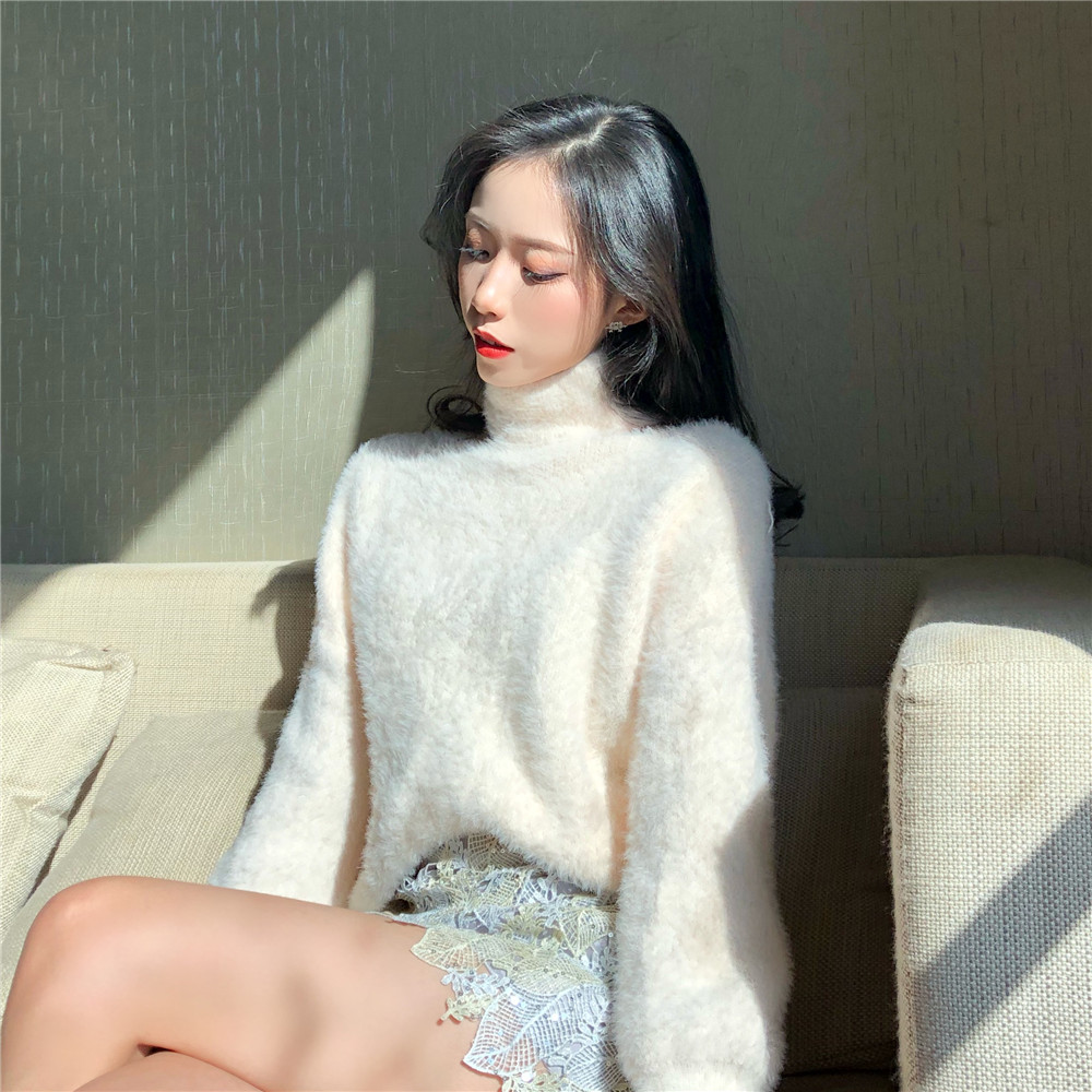 韓版馬海毛套頭掛脖漏肩毛衣女秋冬2018新款寬松針織打底衫上衣潮
