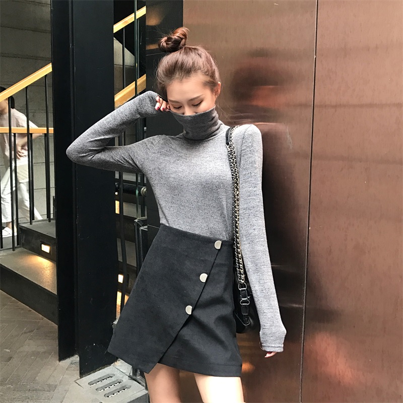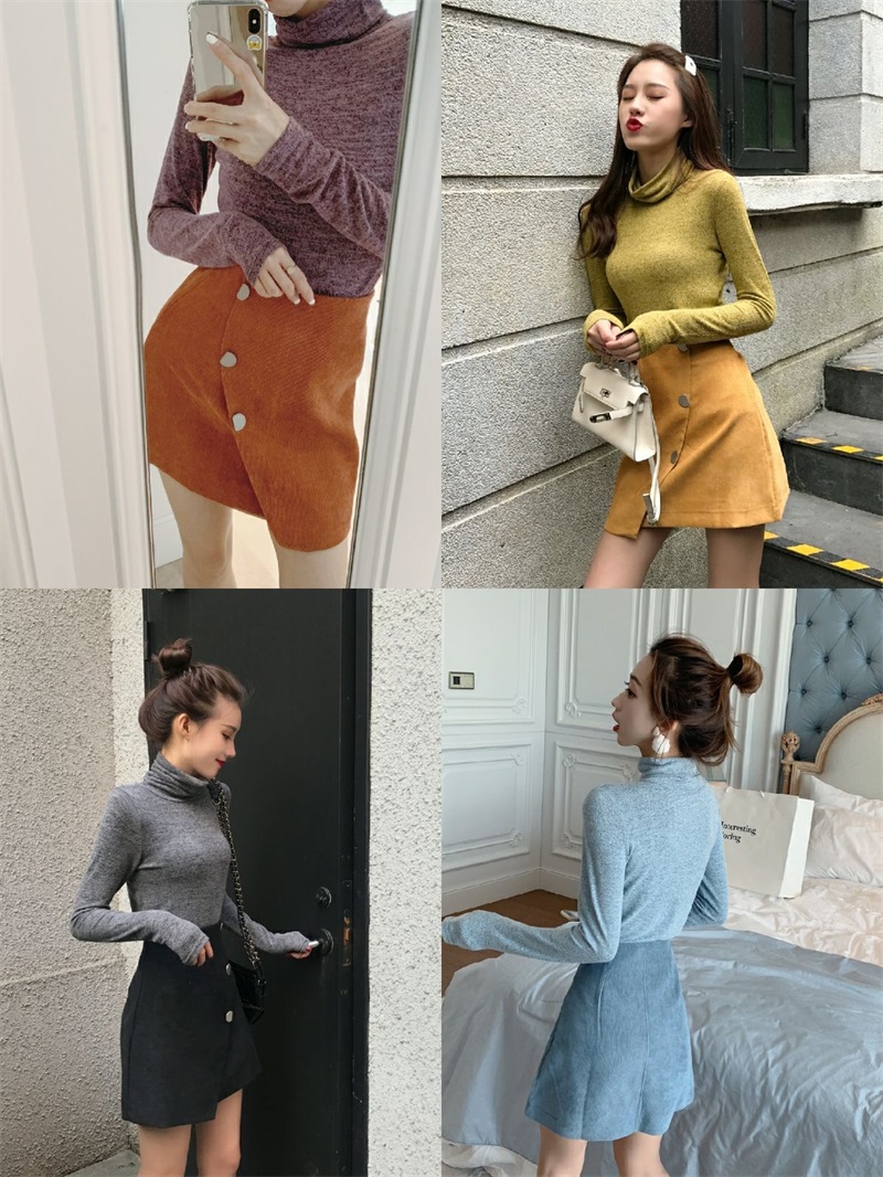 新款排扣不規則高腰半身裙包裙時尚套裝純色高領基礎打底衫兩件套