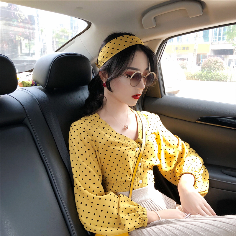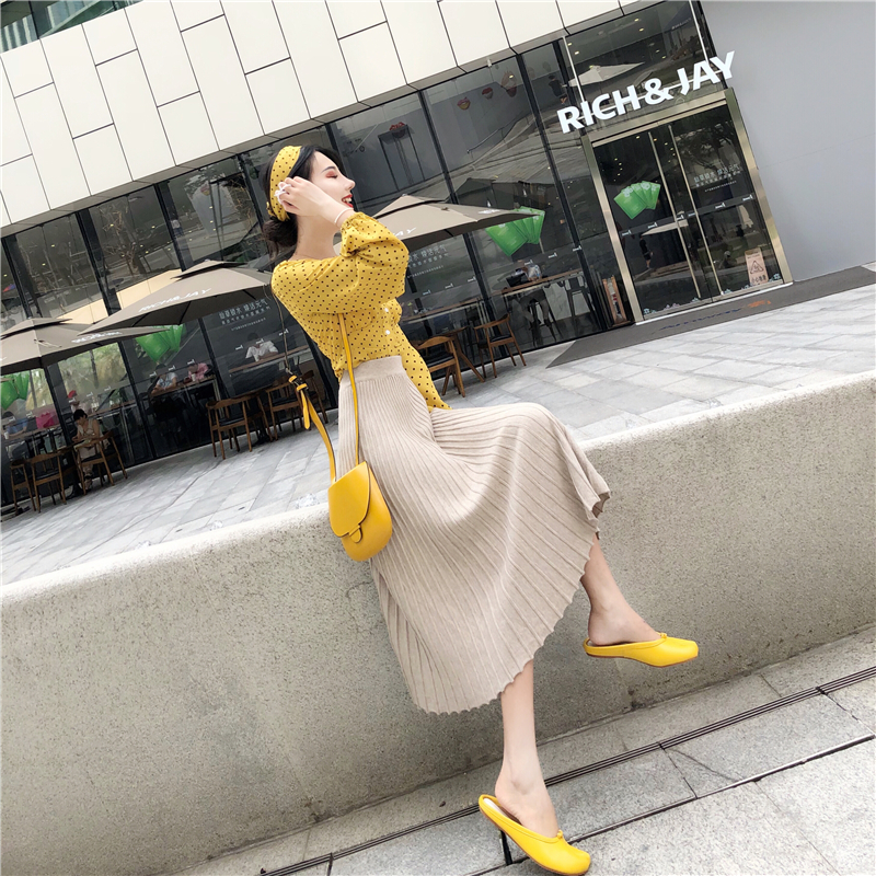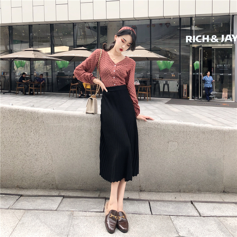 新款百搭復古波點襯衫配頭巾A字針織百褶裙港風時尚套裝兩件套女