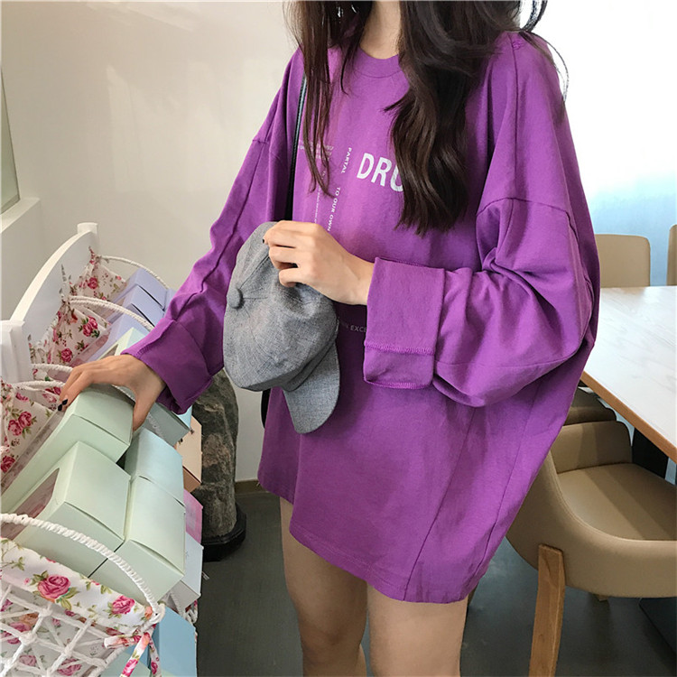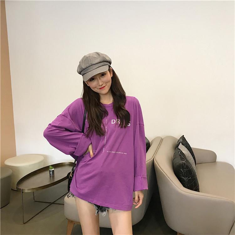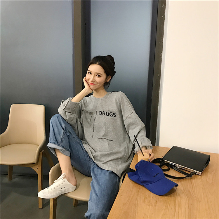 chic早秋上衣女2018新款韓版百搭寬松顯瘦露背字母印花長袖T恤潮