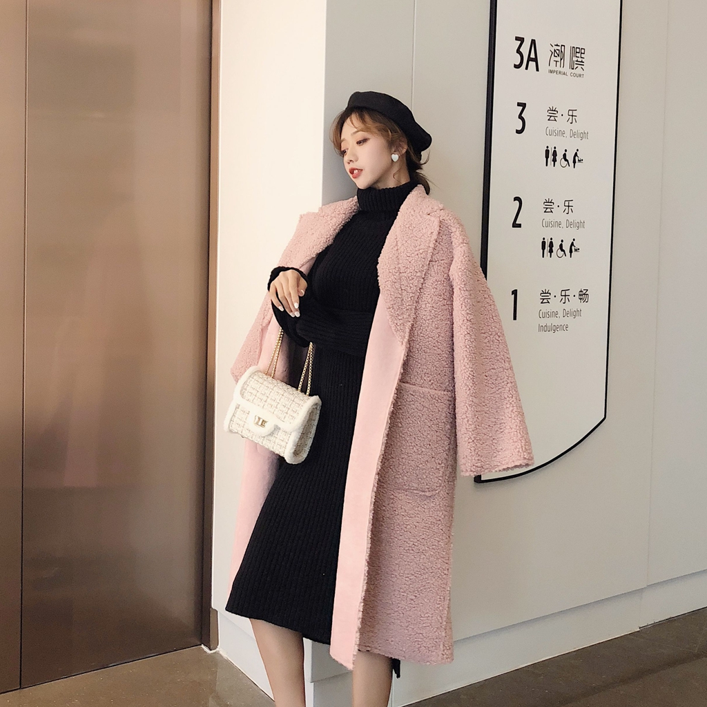 / 女神套裝西裝領雙排扣口袋仿羊羔毛長款大衣外套+高領加厚連衣裙
