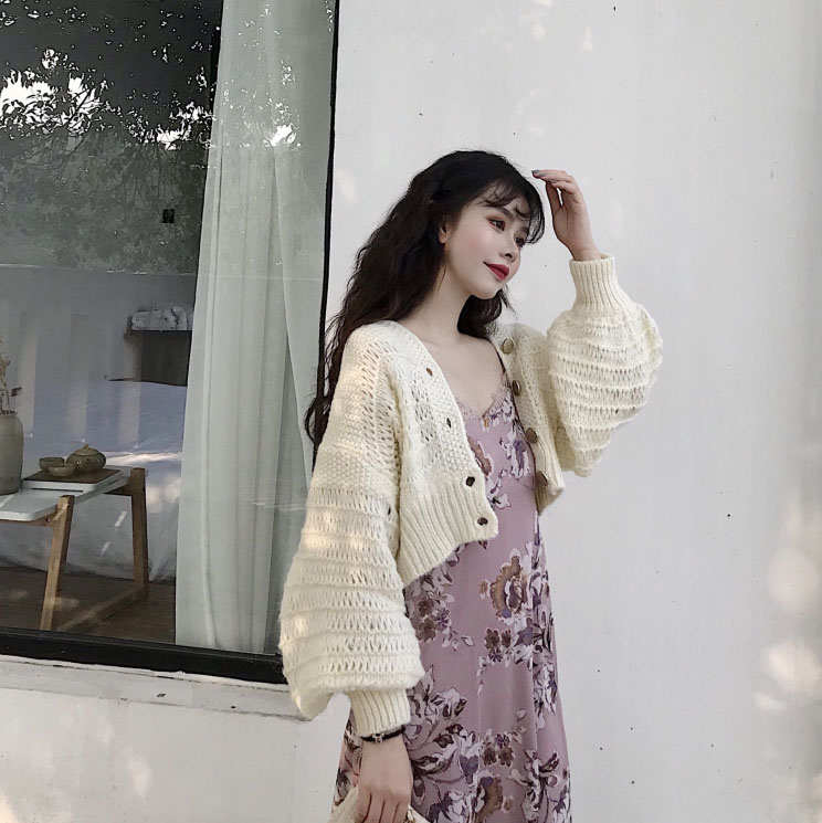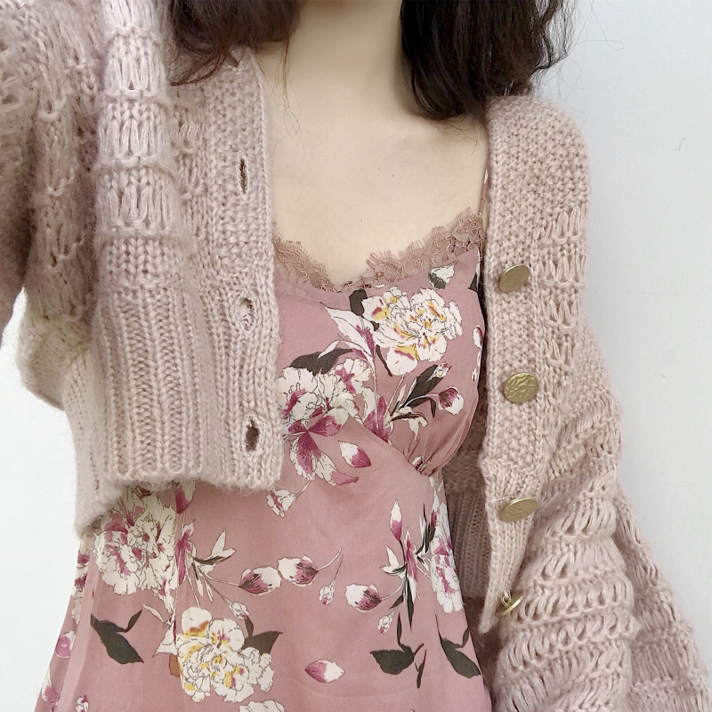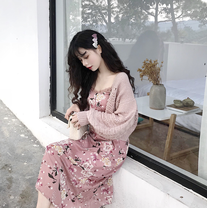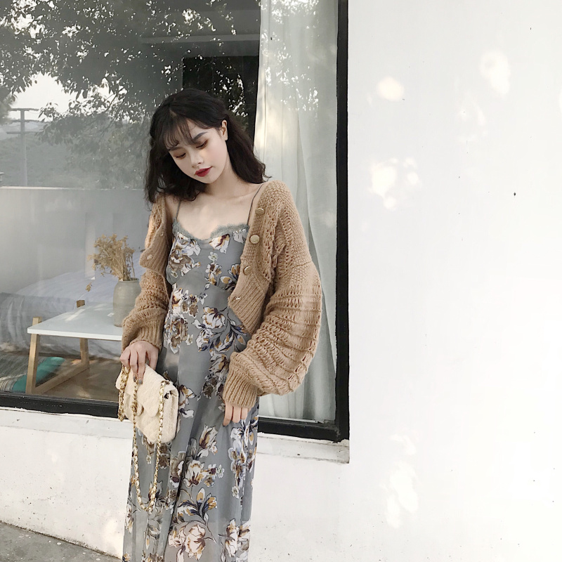 氣質優雅印花長款吊帶蕾絲連衣裙女+復古鏤空燈籠袖短款毛衣開衫