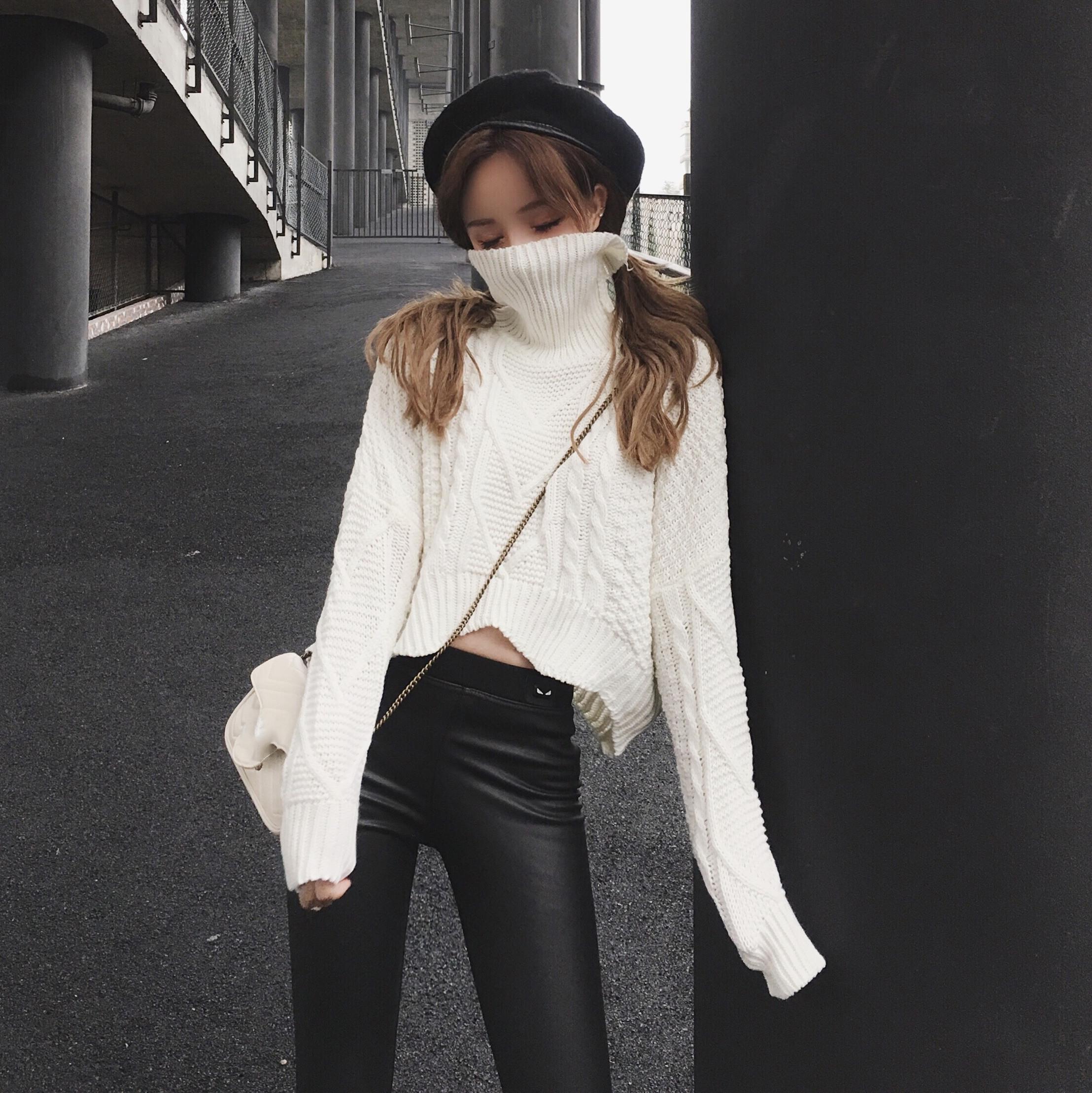 / 復古女神套裝秋冬高領麻花毛衣+高腰加絨外穿打底皮褲長褲兩件套