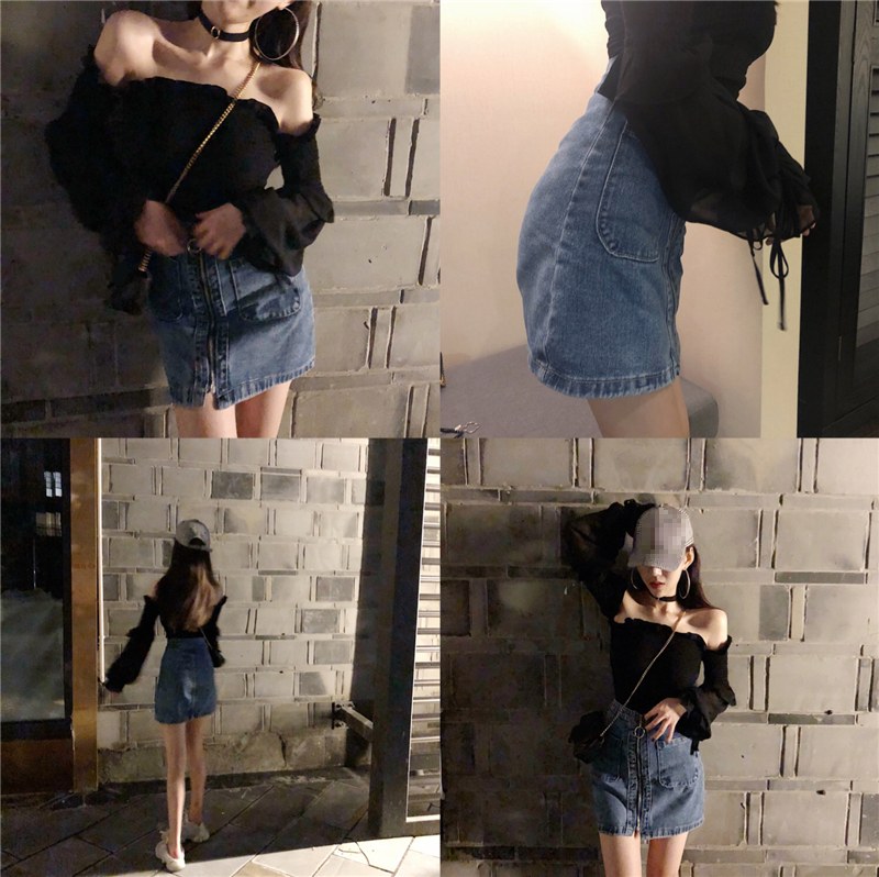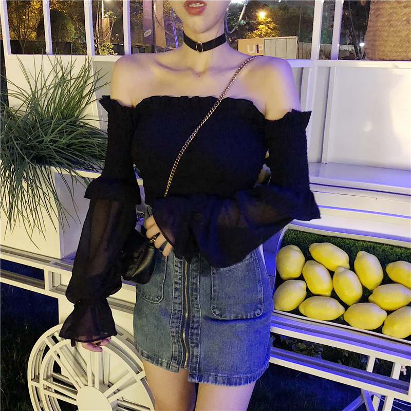 / 小心機新款韓版港風時尚百搭一字領漏肩簡約拼接設計假兩件雪紡衫
